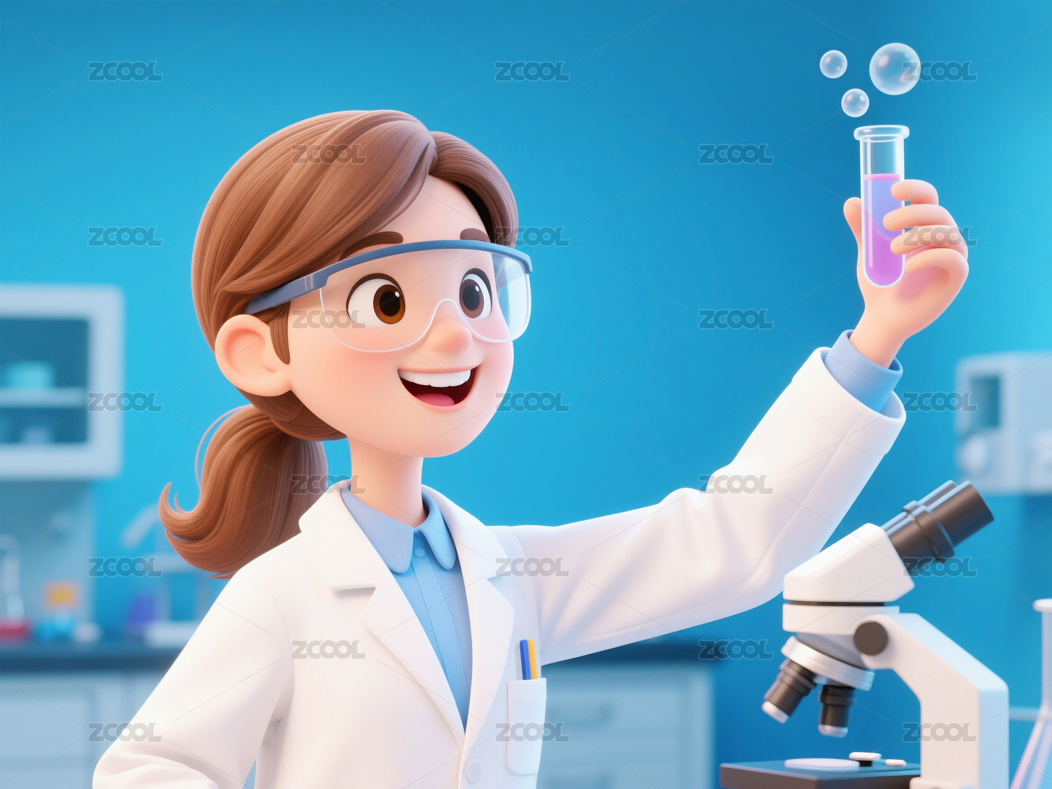 女性穿着白大褂在实验室里烧杯器材3D插画