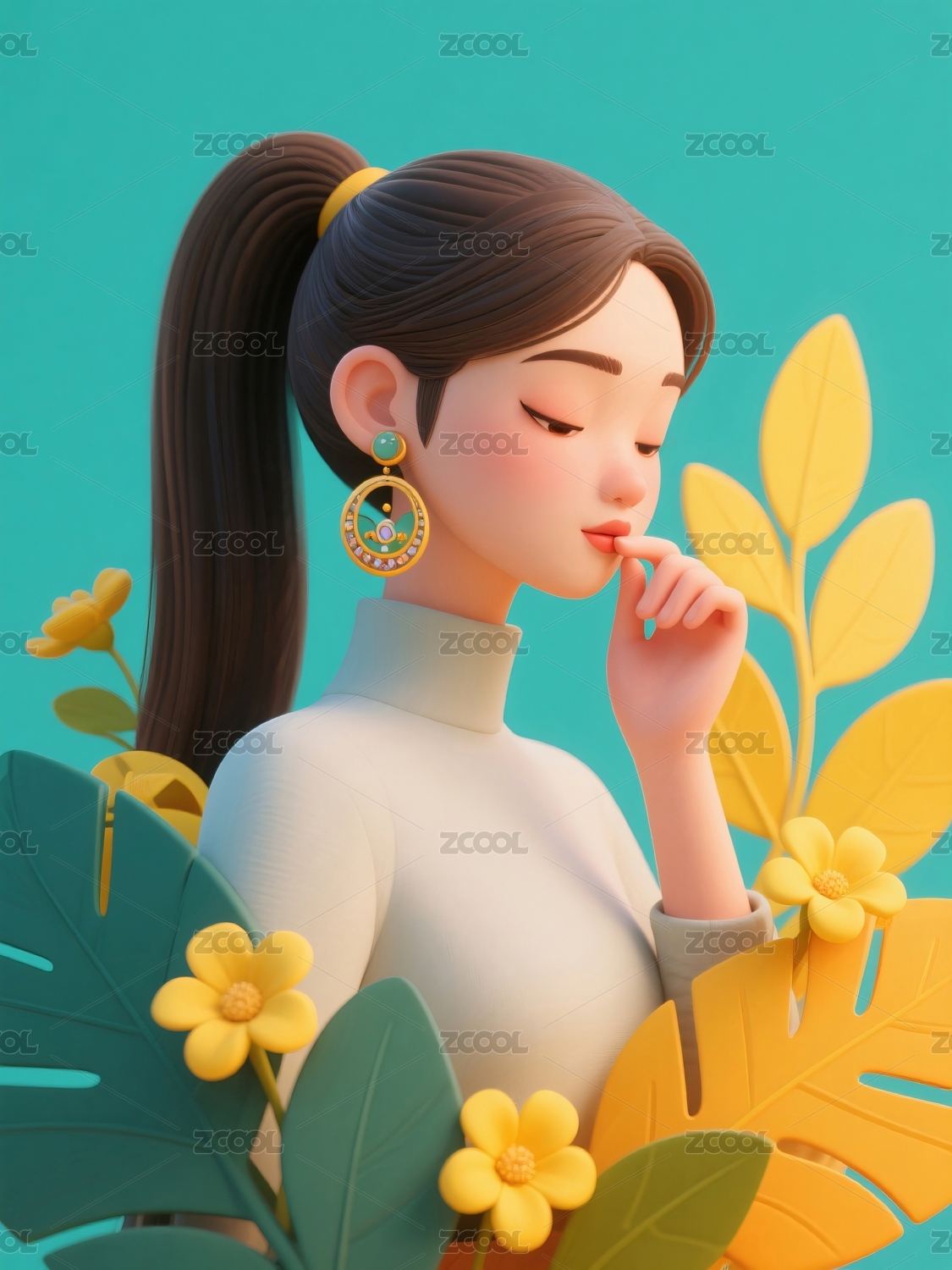 女子沉思姿态周围植物