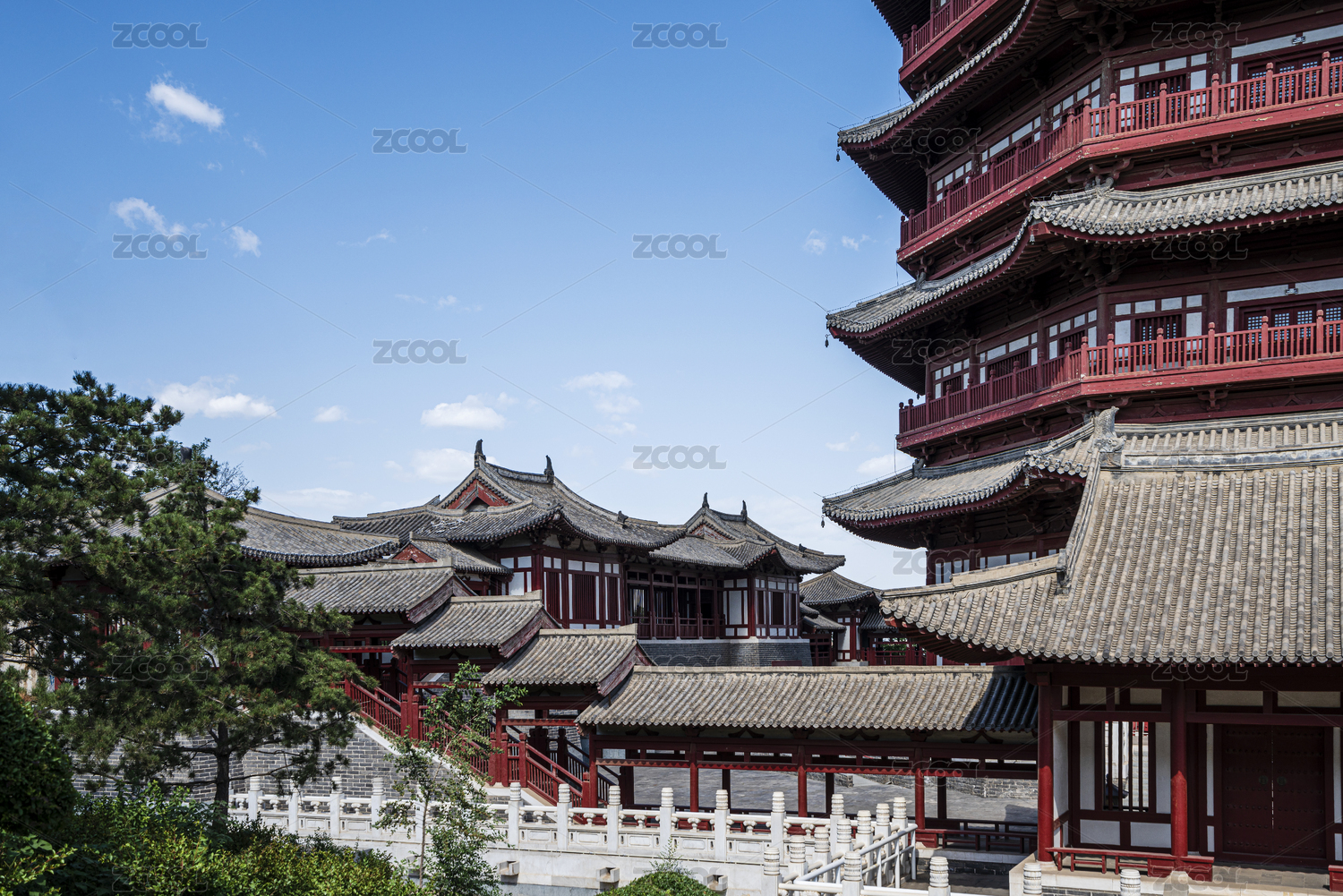 蓝天背景下古建筑楼宇飞檐