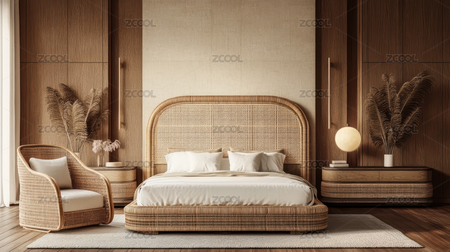 卧室,床,藤编,家具,室内设计,温馨,舒适,植物,自然,简约