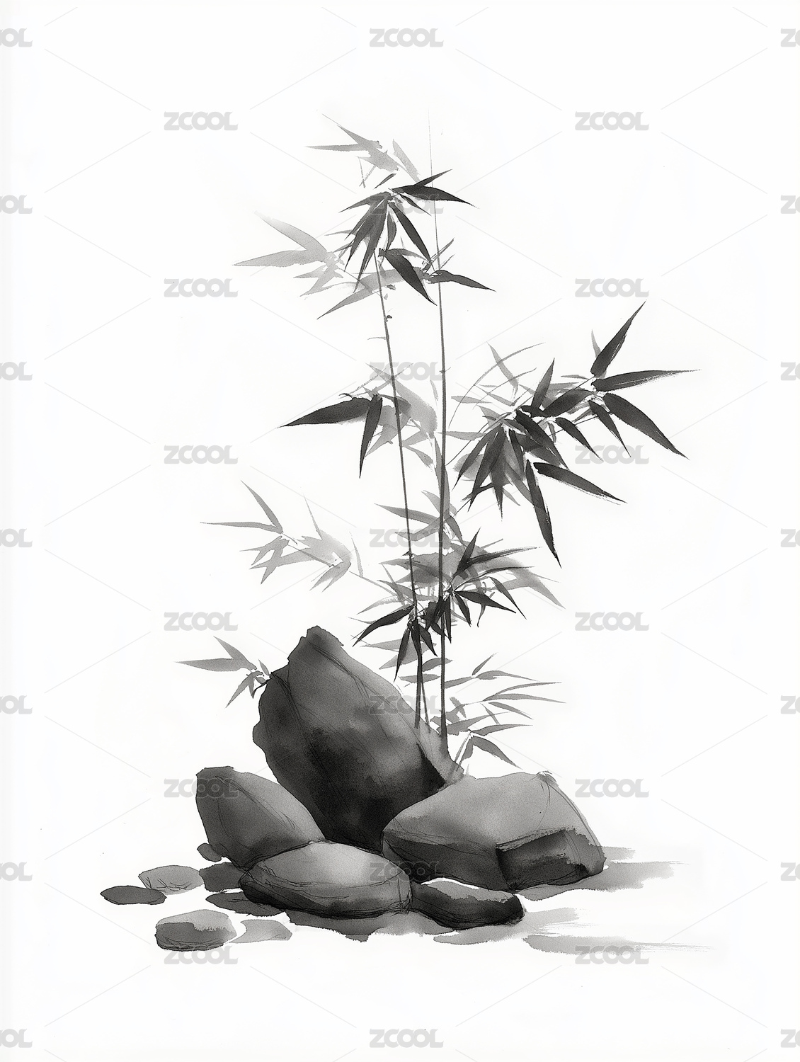 水墨竹石图国风插画装饰画背景素材