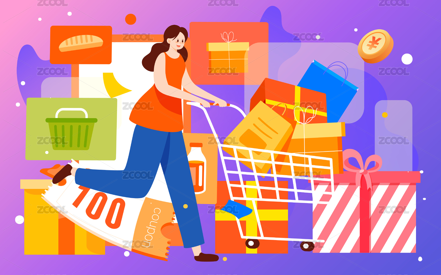 一对情侣推着购物车购买商品,女生手提包包坐在购物车上插画背景