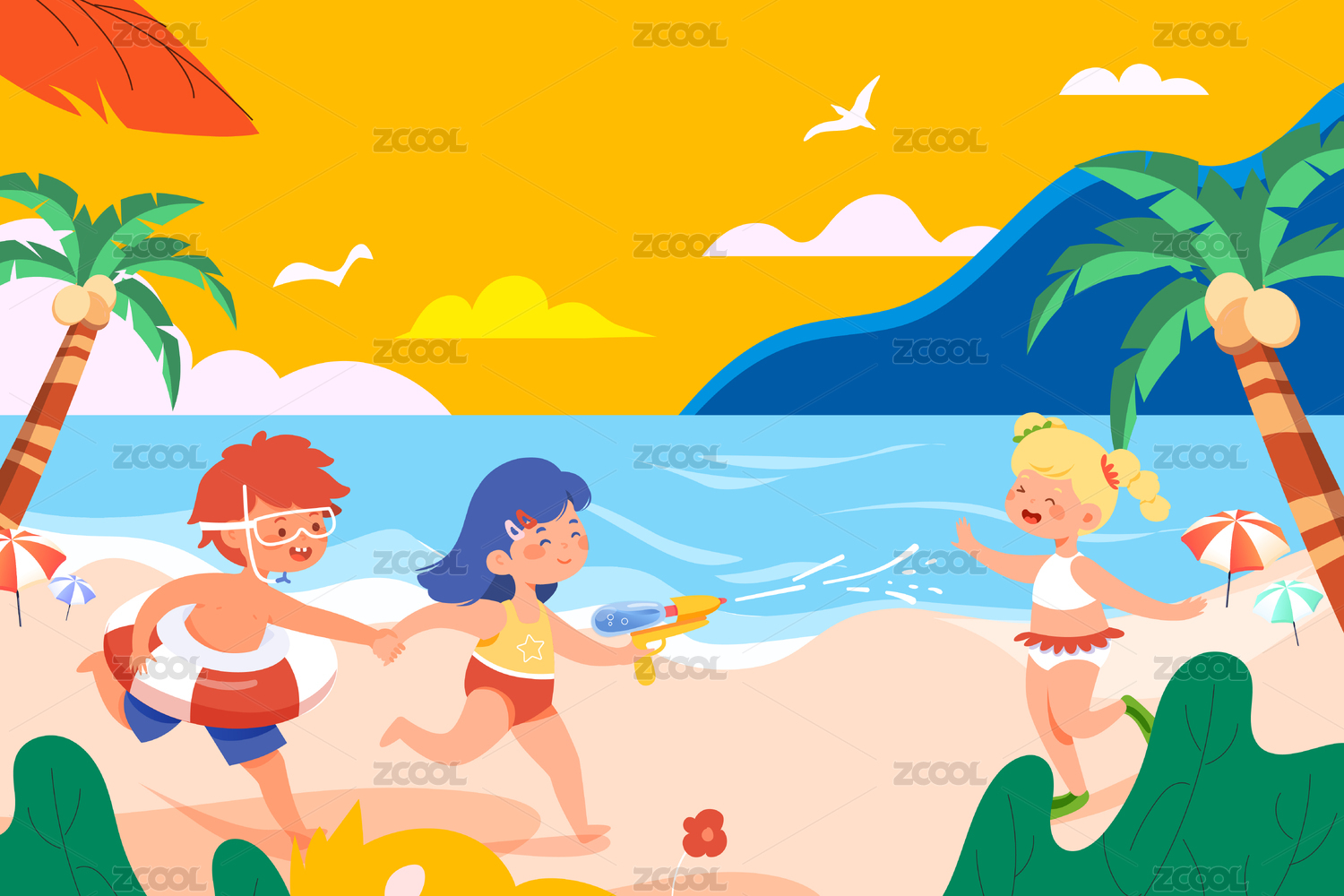 儿童玩乐海边矢量插画