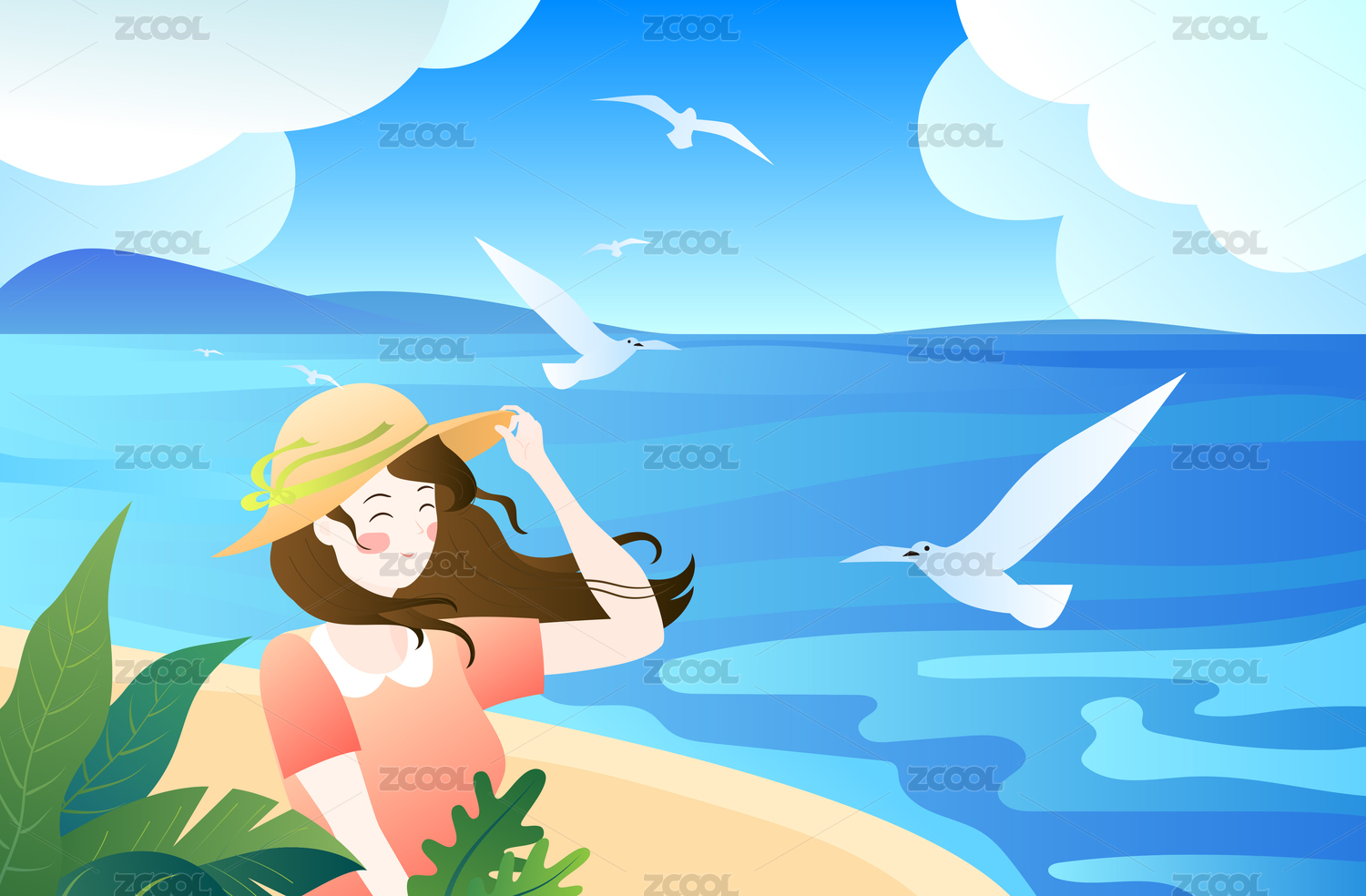 美女在海边沙滩上旅游看风景拍照,海浪在不断拍打着海岛岸边的细沙插画矢量海报