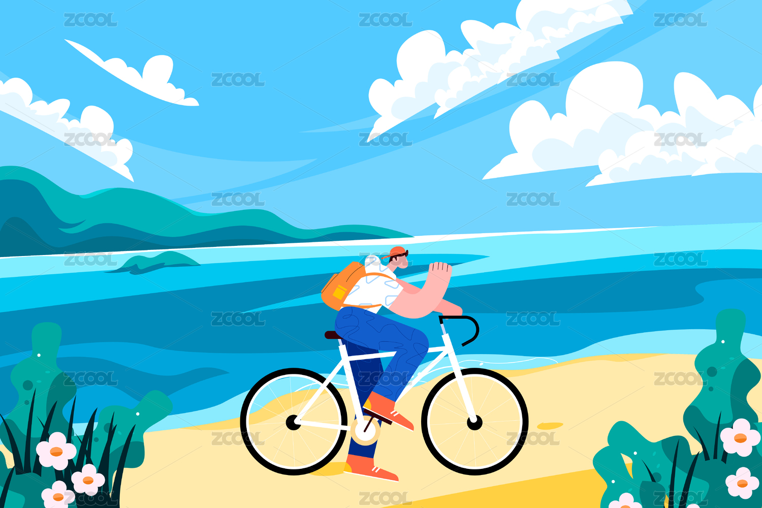 横版海滩边骑西瓜自行车的女孩矢量插画