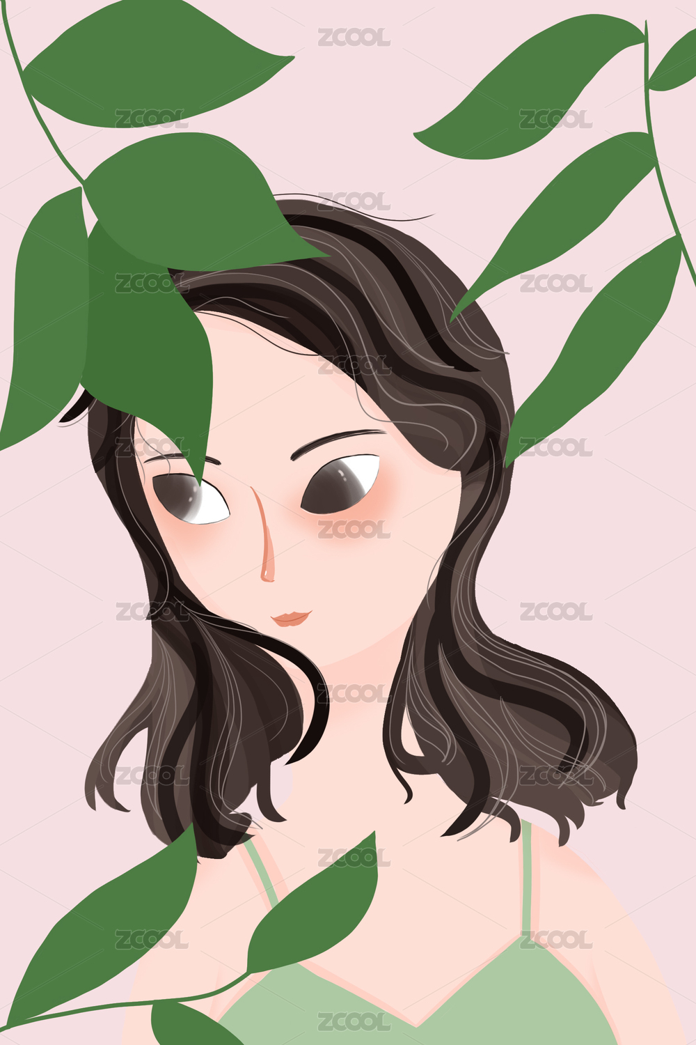 被绿叶环绕的卡通女性
