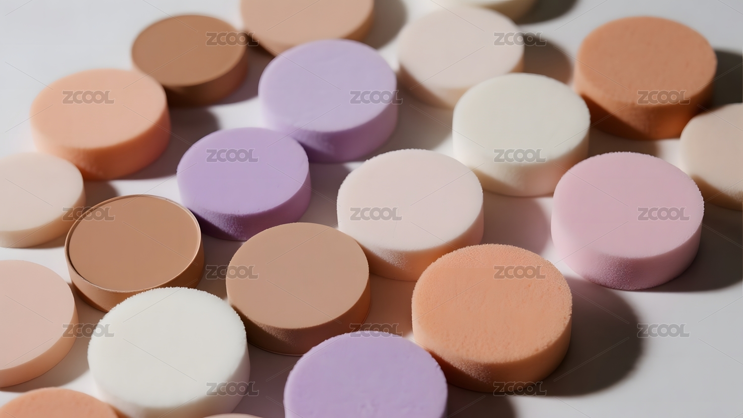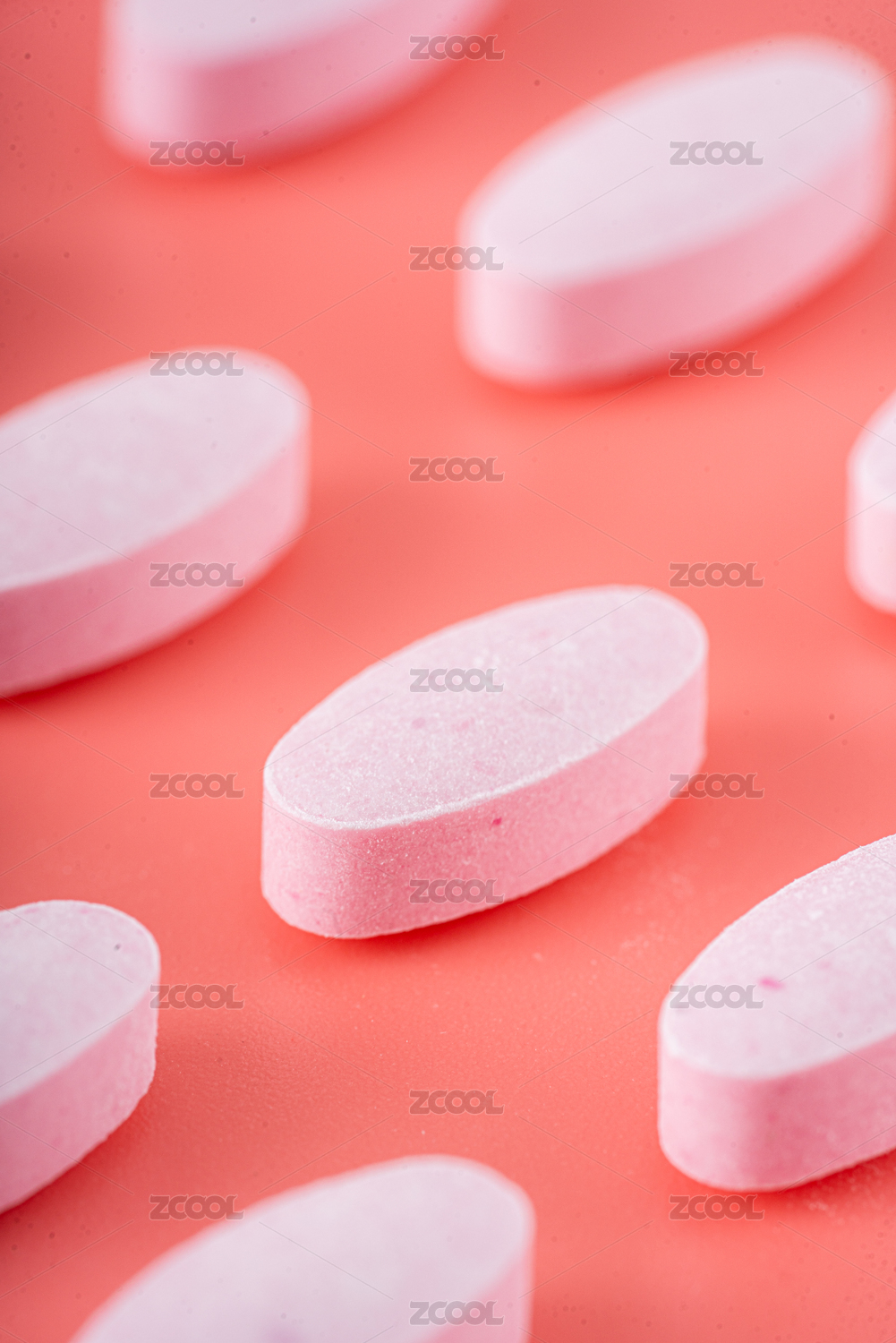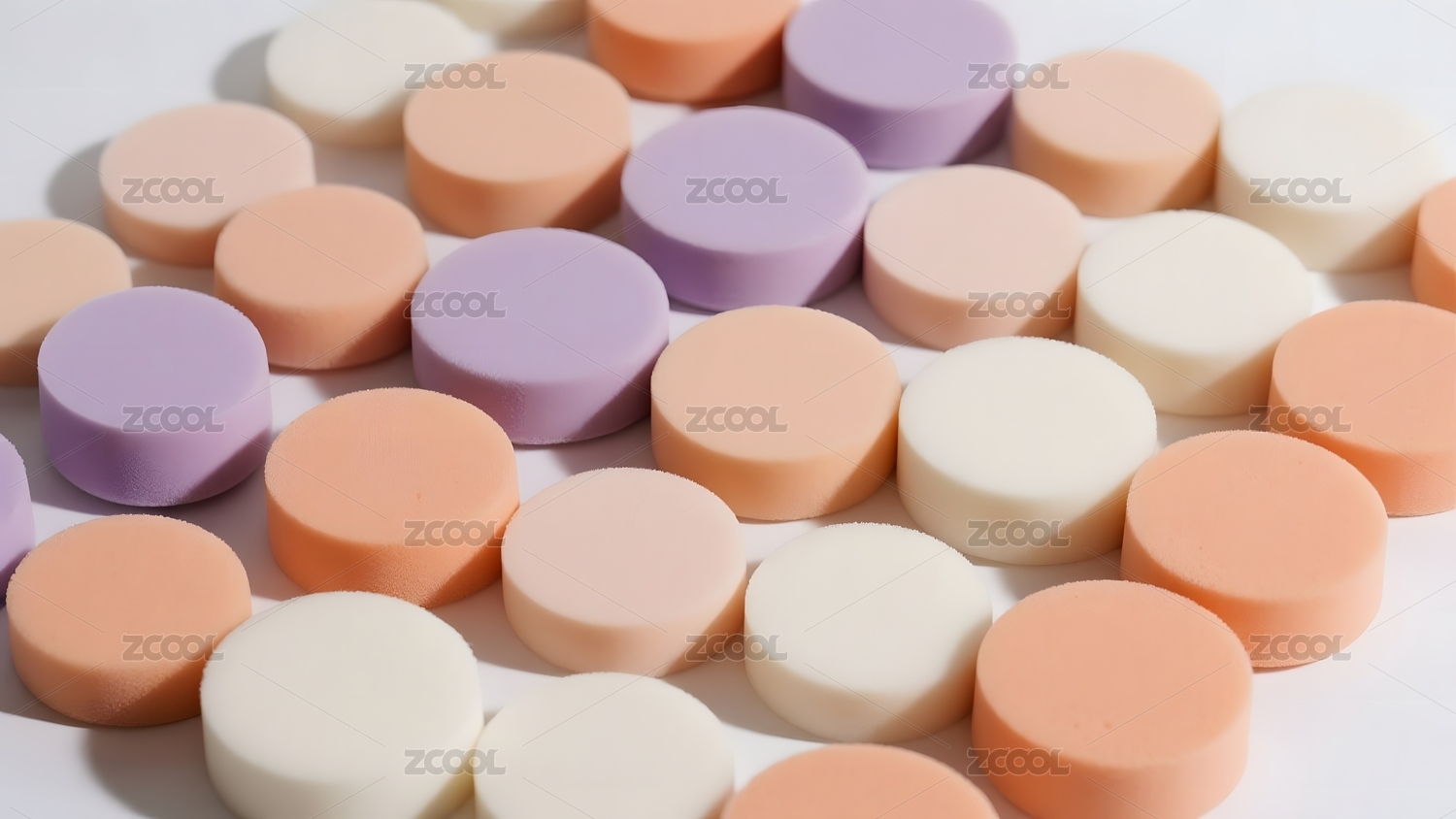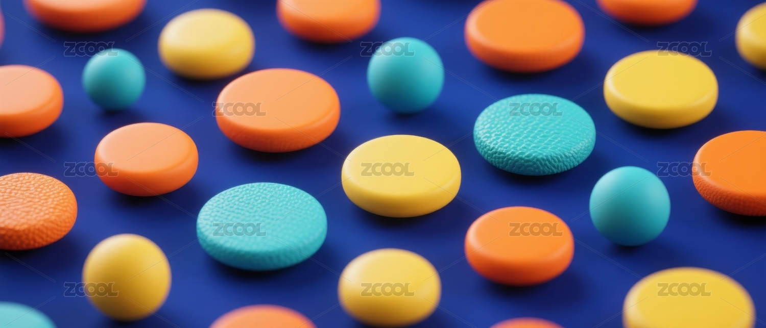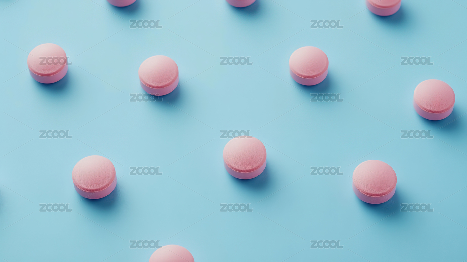 粉色和蓝色药片在浅蓝色背景上排列整齐