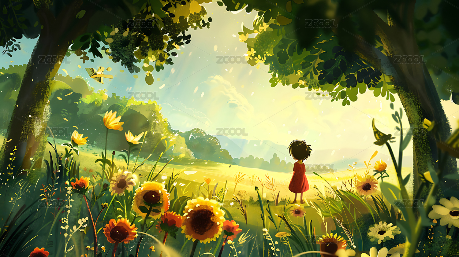 新海诚风格植物大树阳光夕阳日漫卡通插画