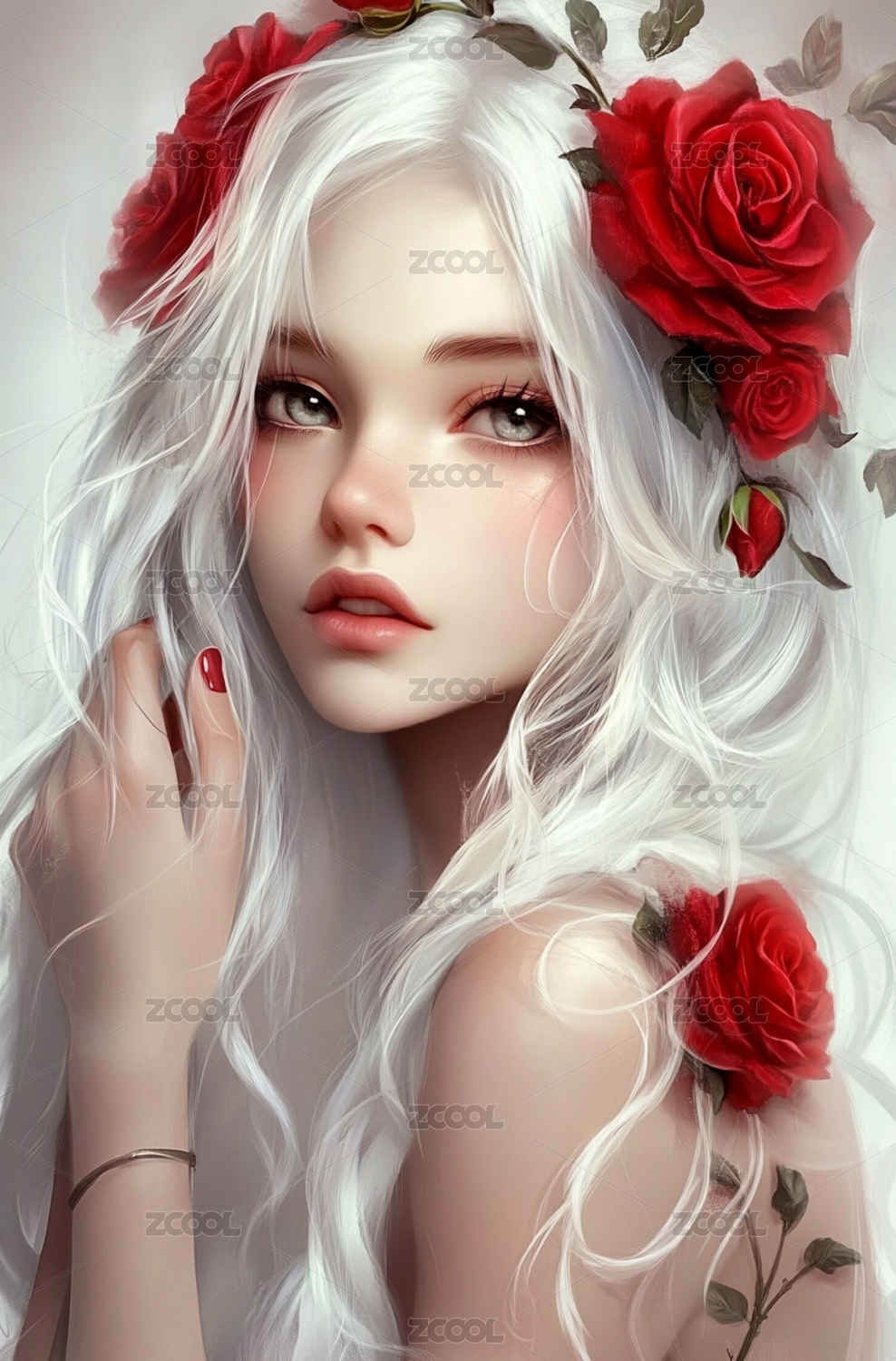白发红玫瑰女孩浪漫唯美动漫海报油画壁纸