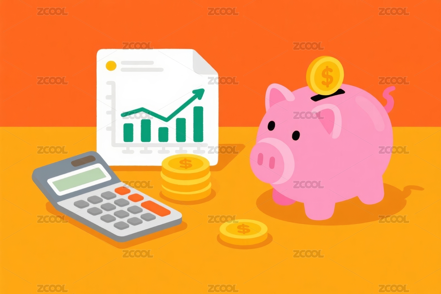 扁平风小猪存钱罐计算器和金币插画