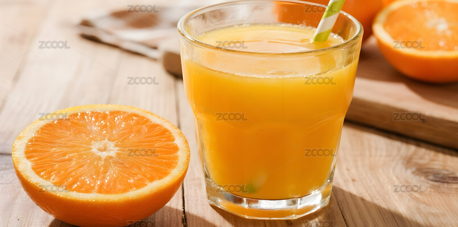 玻璃杯里的橙汁和切开的橙子放在木桌上
