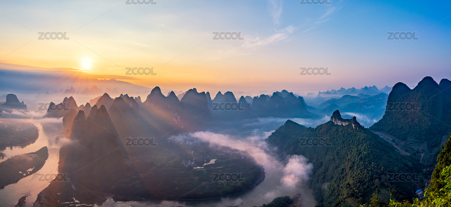 广西桂林阳朔大面山群山漓江日出
