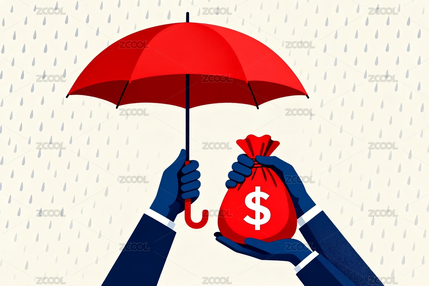 商人打伞保护货币概念。规避金融风险和安全投资。金融储蓄、财富管理。矢量图。