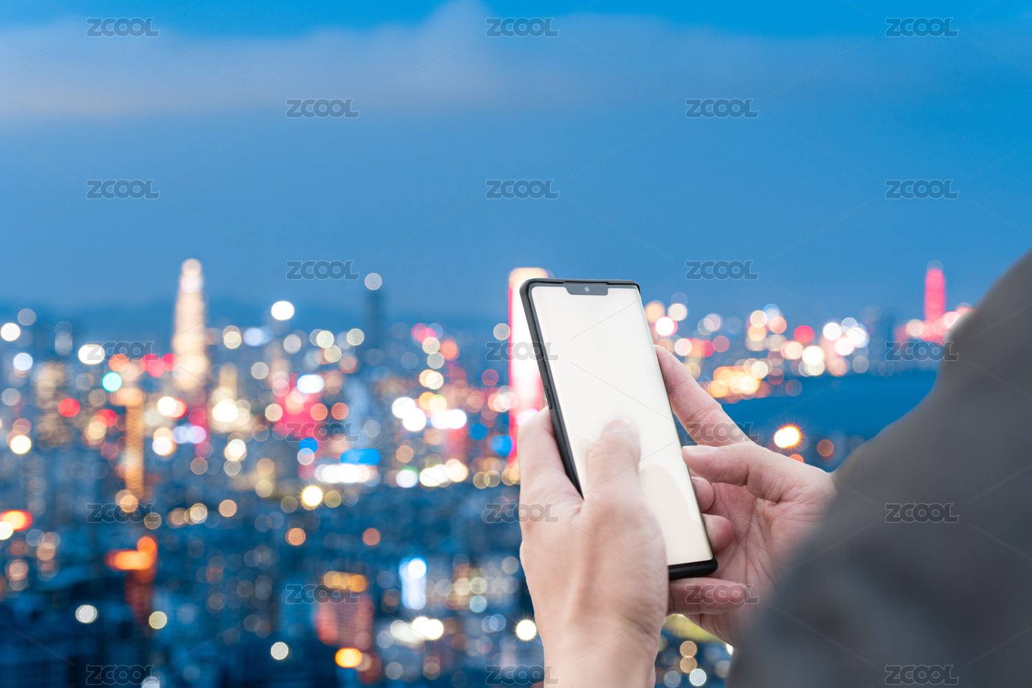 广东深圳前海夜晚天际线和拿着手机的手