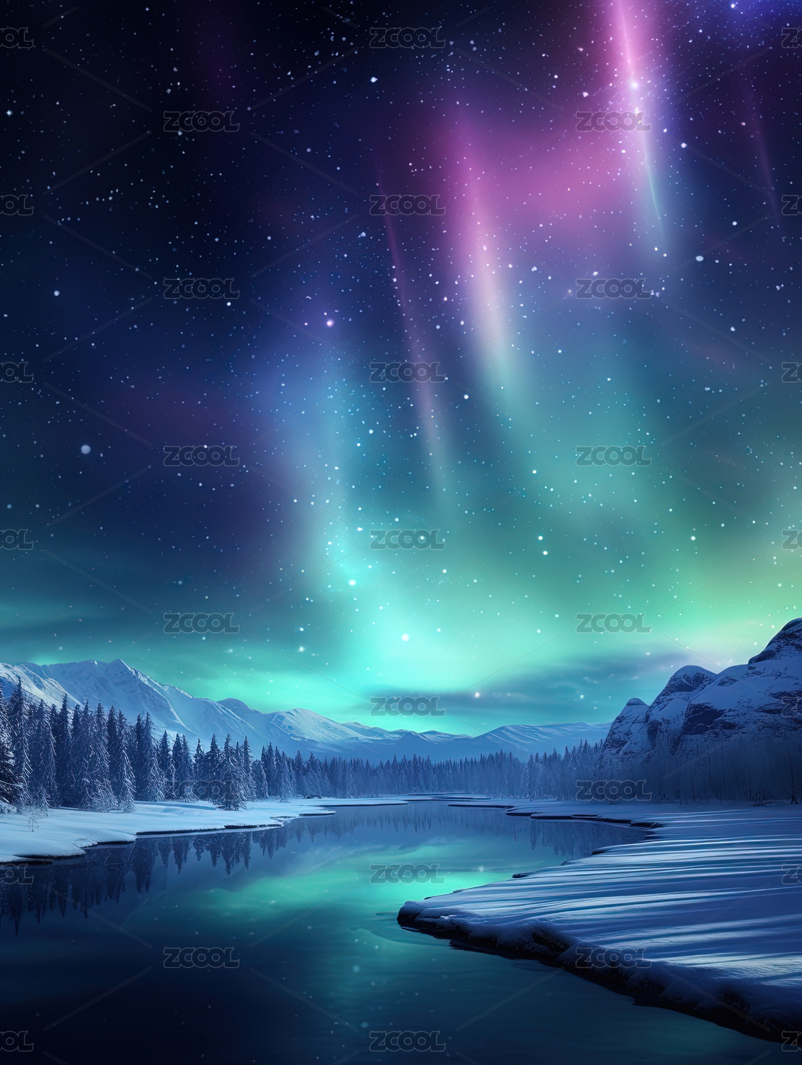 极光倒影下的冰雪仙境
