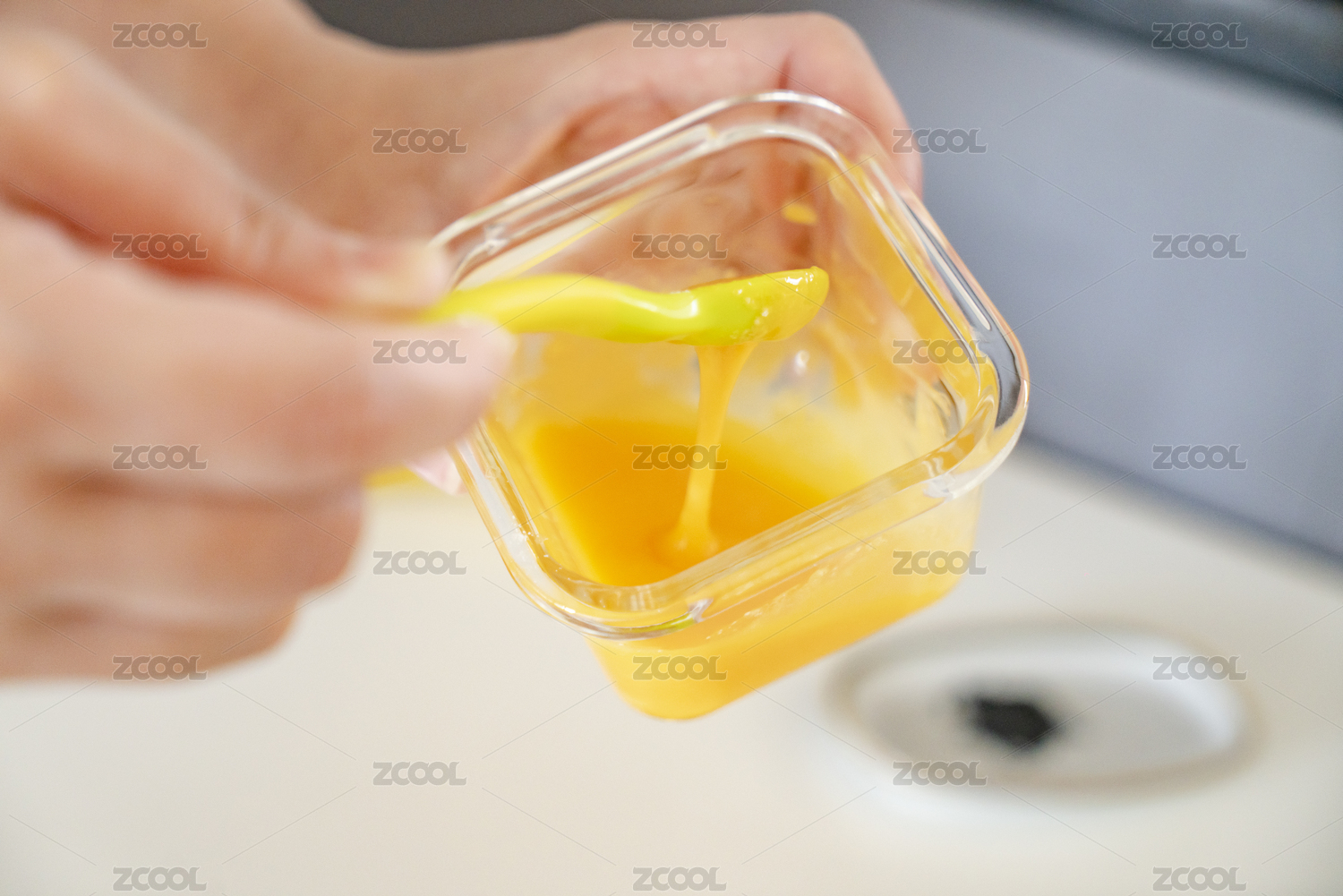 在玻璃碗中用打蛋器搅拌鸡蛋清