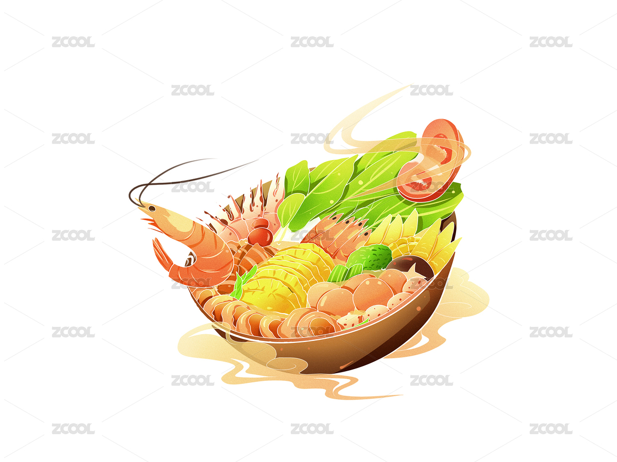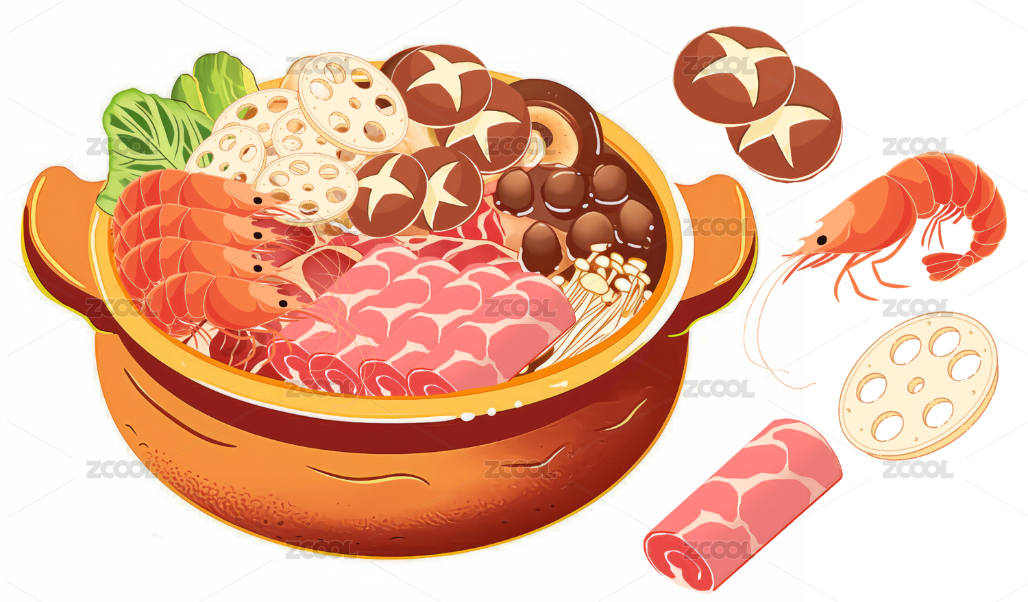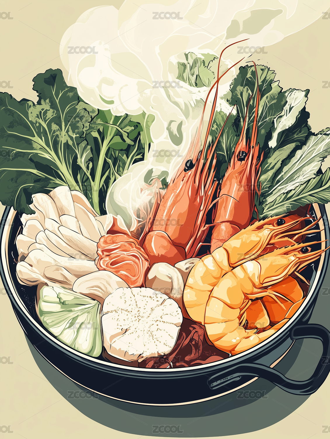 喷溅的汤汁和火锅及火锅食材美食国潮风插画
