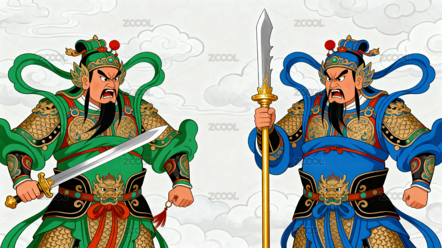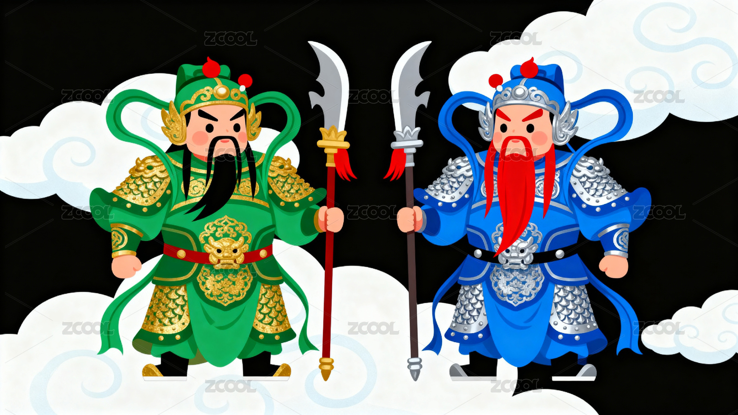 一对门神古装人物横眉冷对手拿兵器刀剑