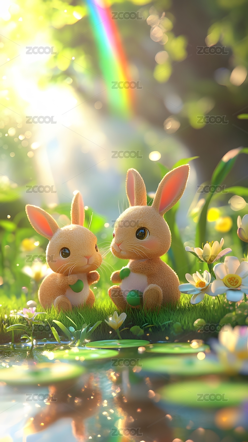 自然,壁纸,背景,三维,立体,3D,卡通,兔子,彩虹,可爱