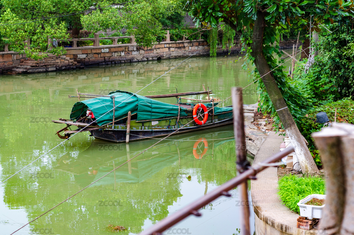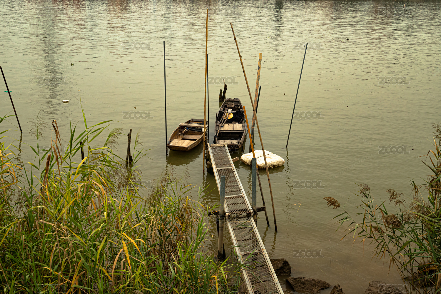 中国广州,两条停泊在沙湾水道芦苇丛中的小舟