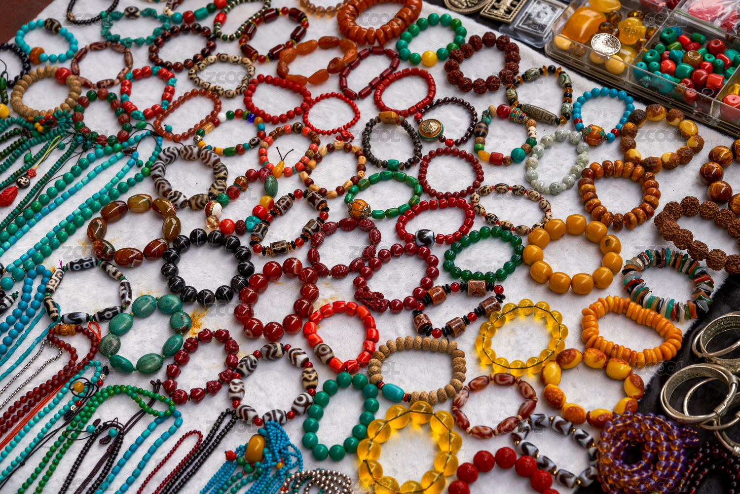 市场上售卖的各种彩色宝石手镯和手环特写