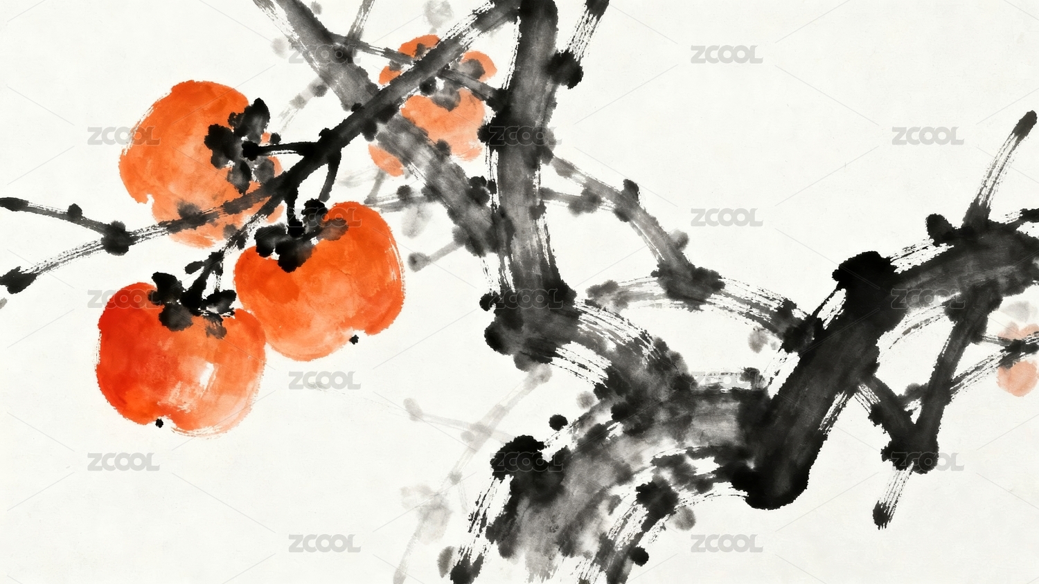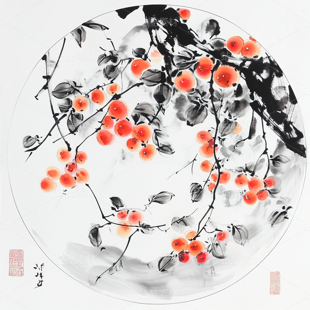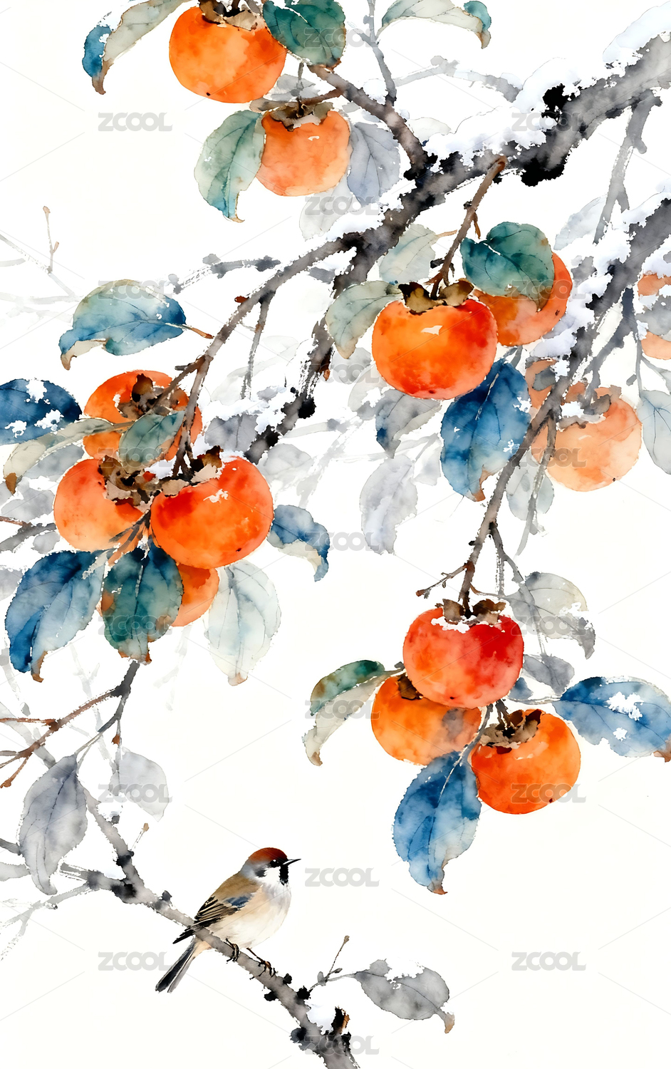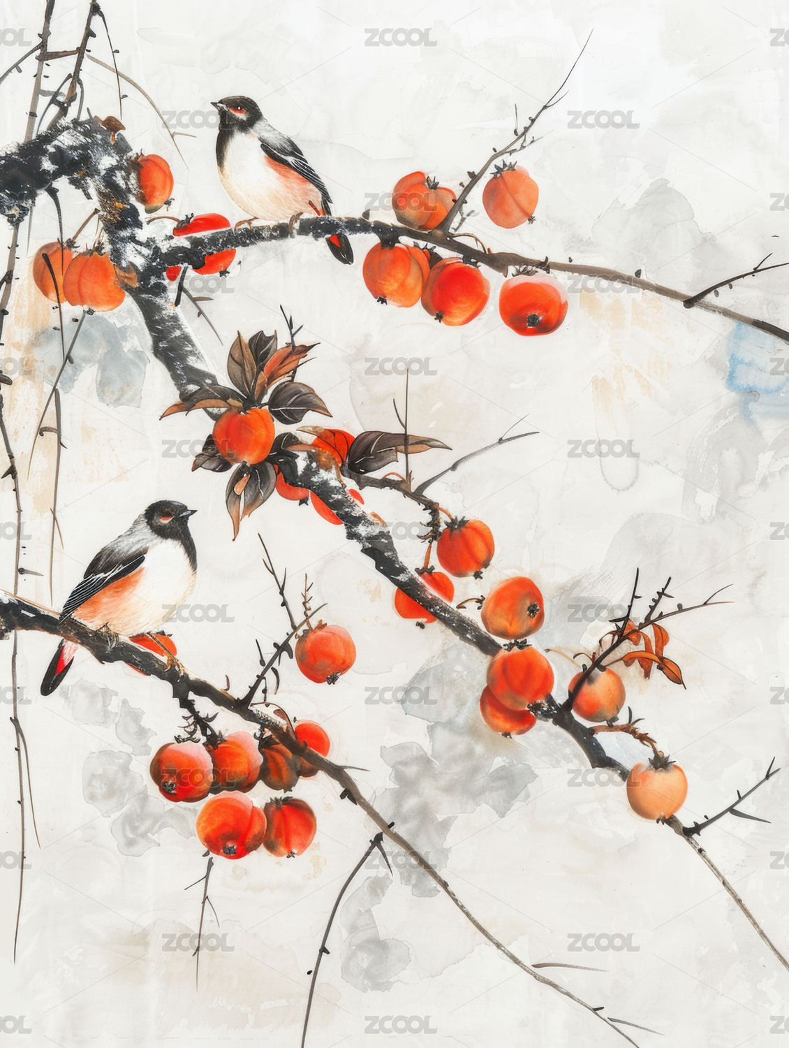 植物,柿子,水果,枝,秋天,秋分,节气,小鸟,立秋,工笔