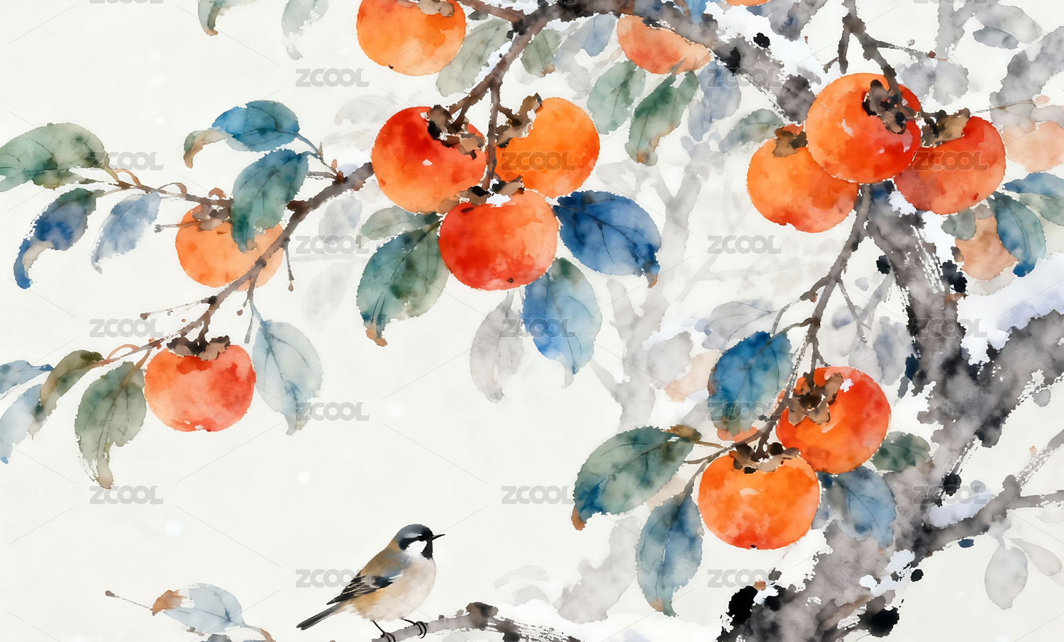 秋天霜降节气柿子树上的鸟插画背景壁纸
