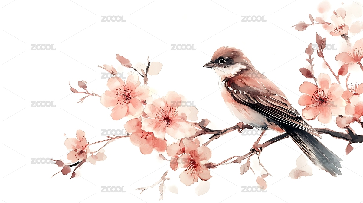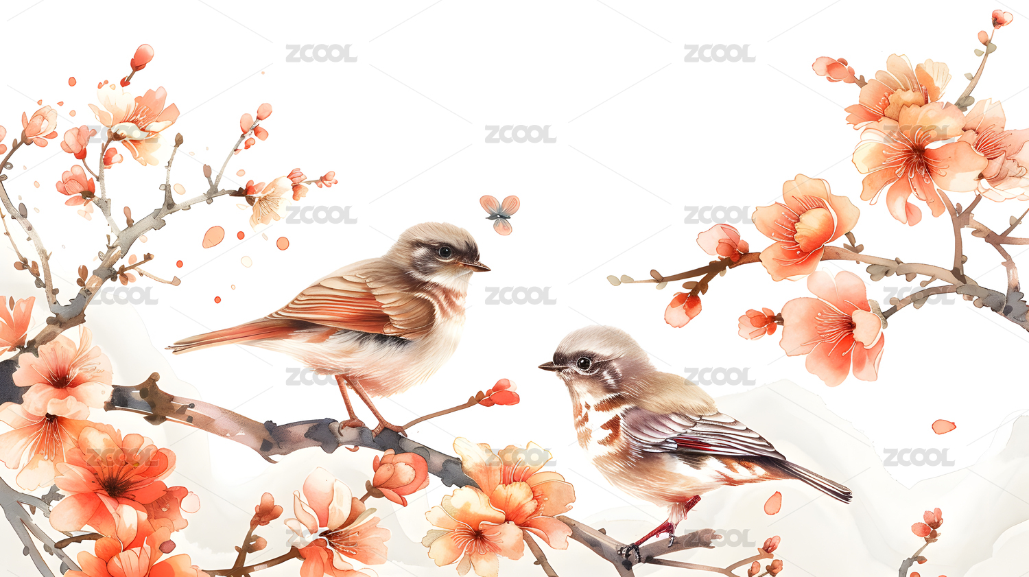 中国风水彩鸟麻雀植物树枝鲜花插画