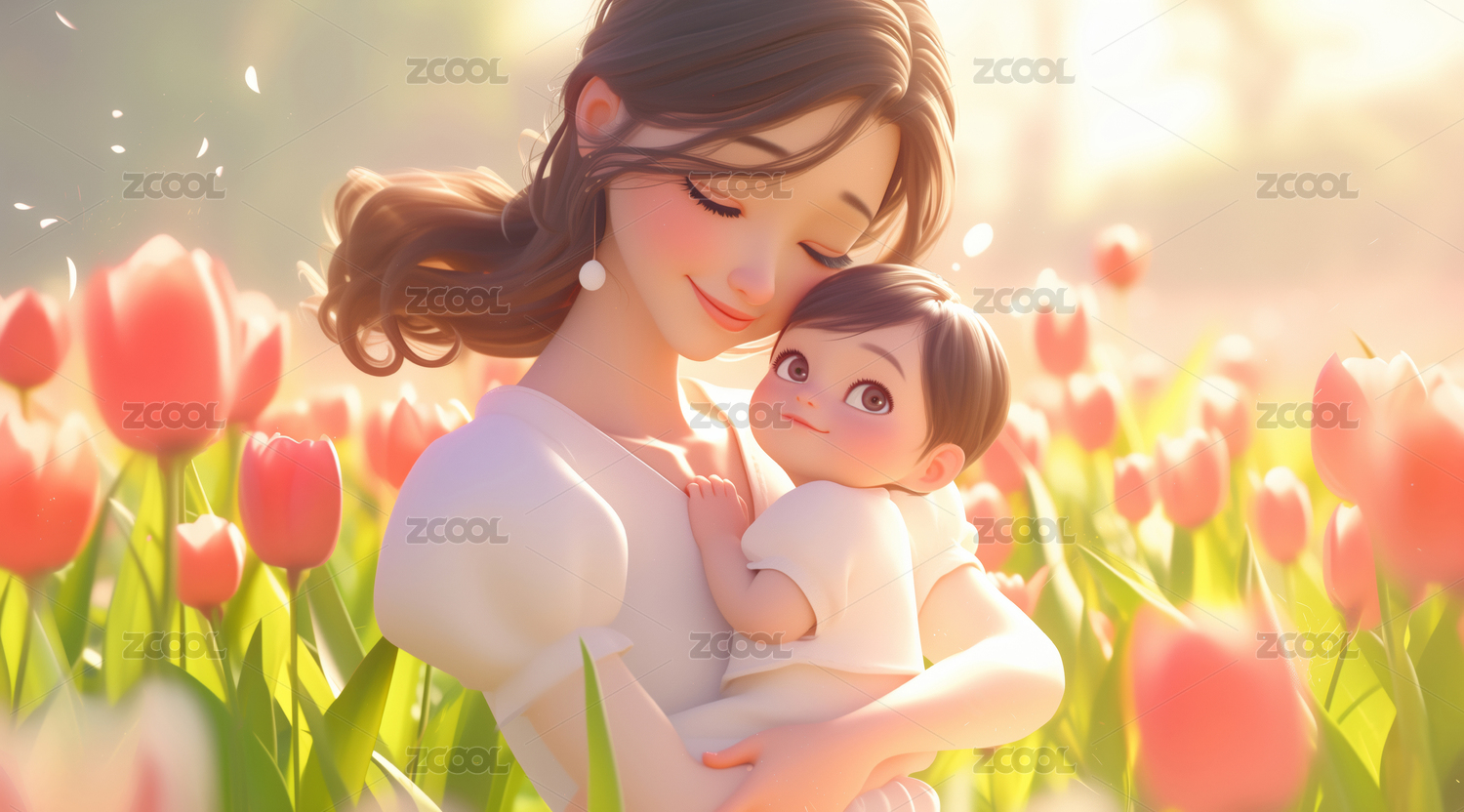 母亲节,亲子,亲人,孩子,幼儿,可爱,长发,妈妈,鲜花,花园