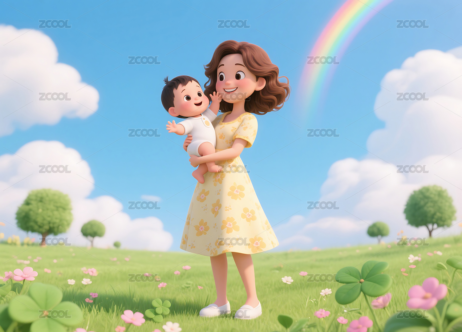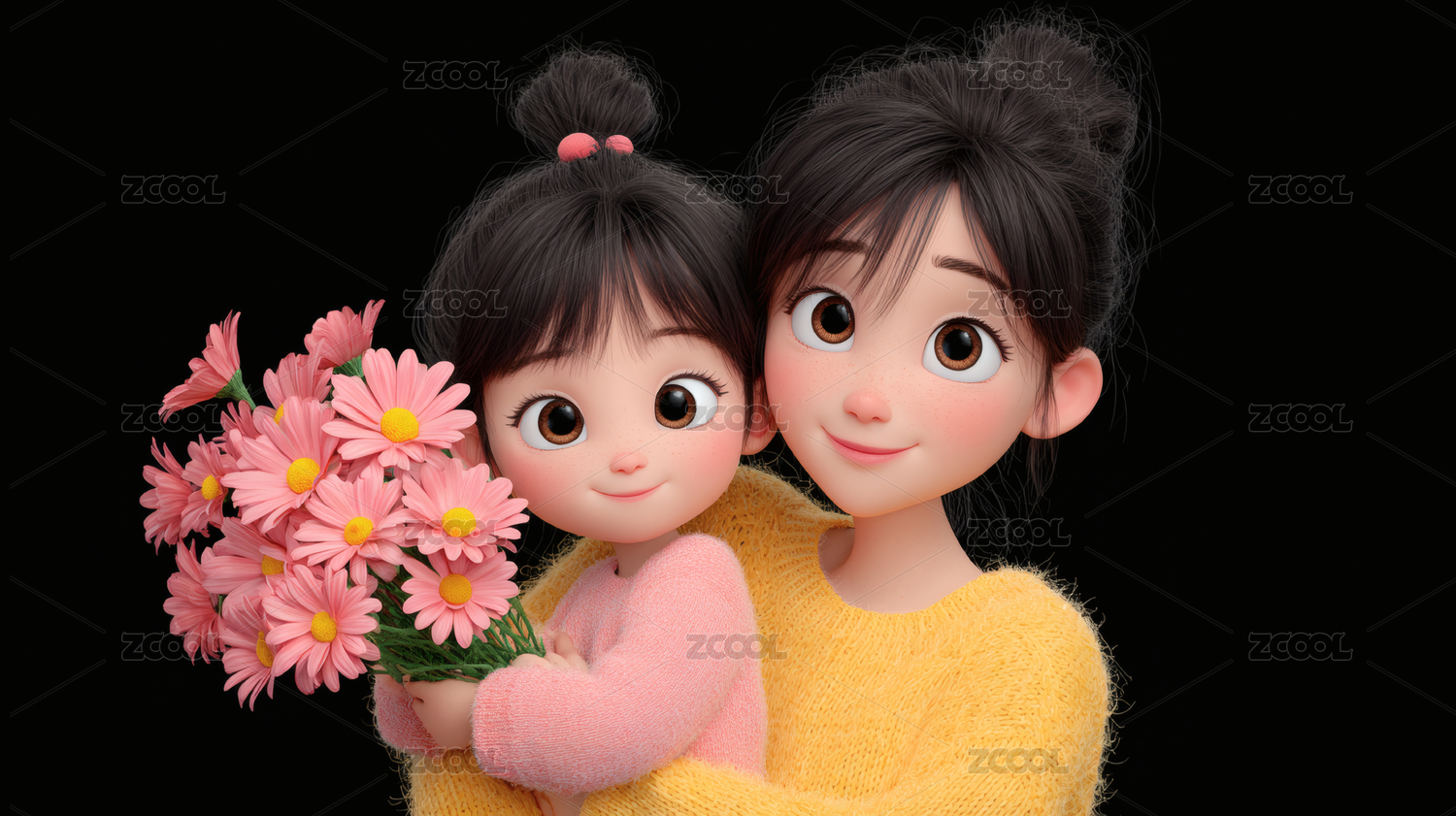 在奇幻多彩背景下一个女生抱着一个小女孩