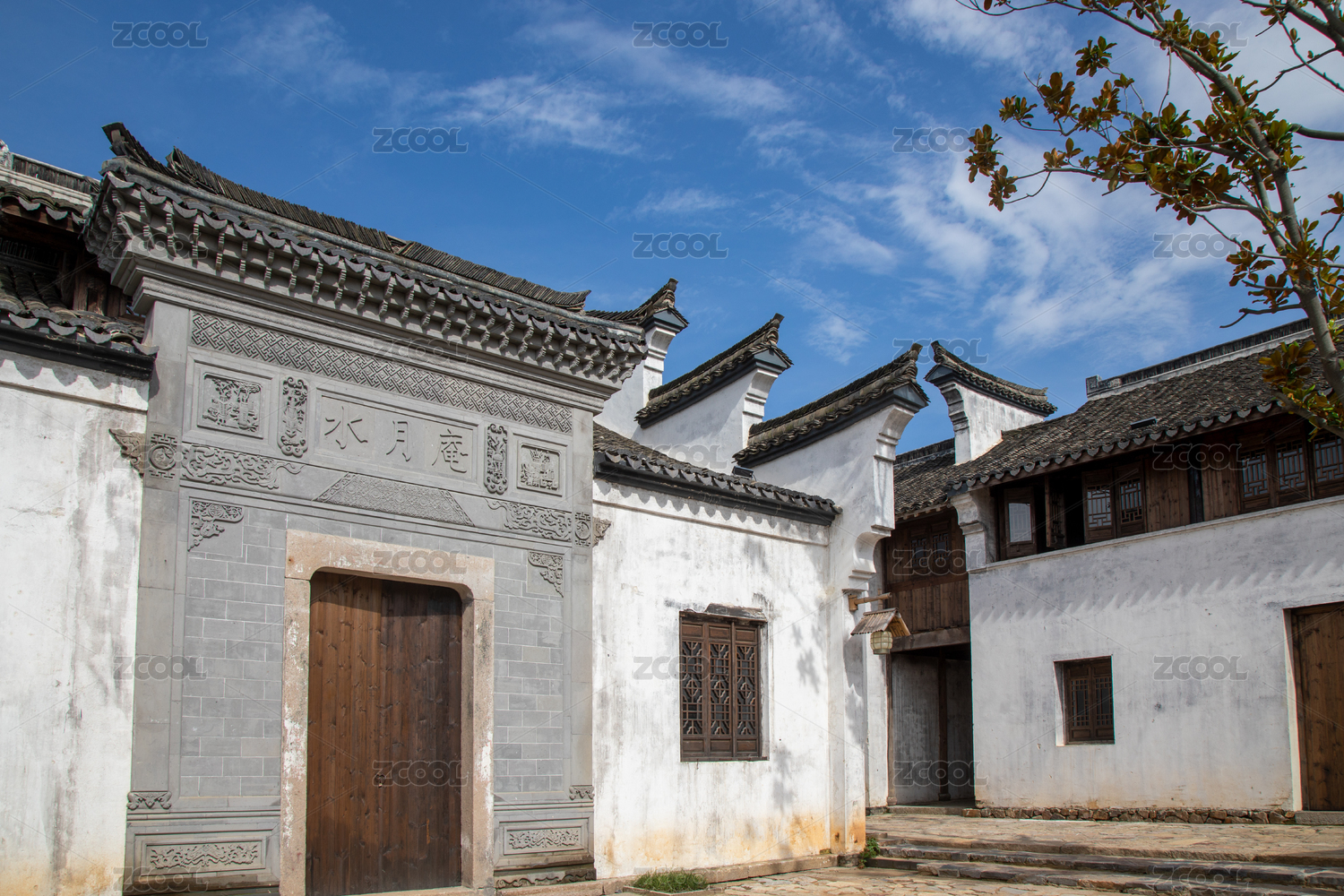 蓝天白云下树荫点缀的黑瓦白墙古建