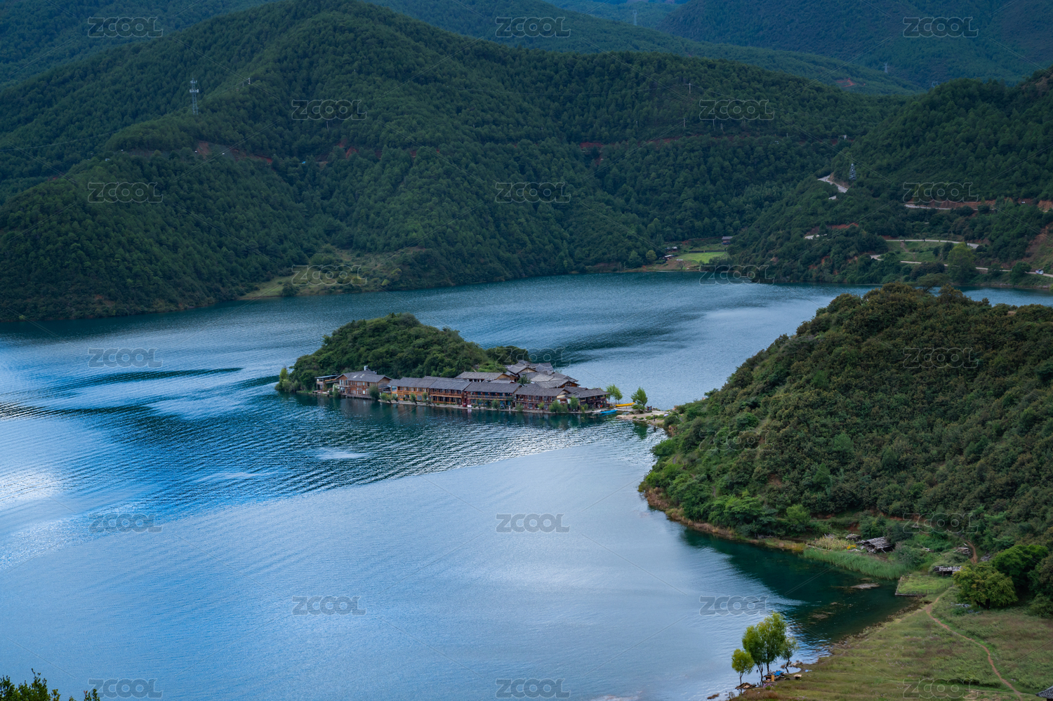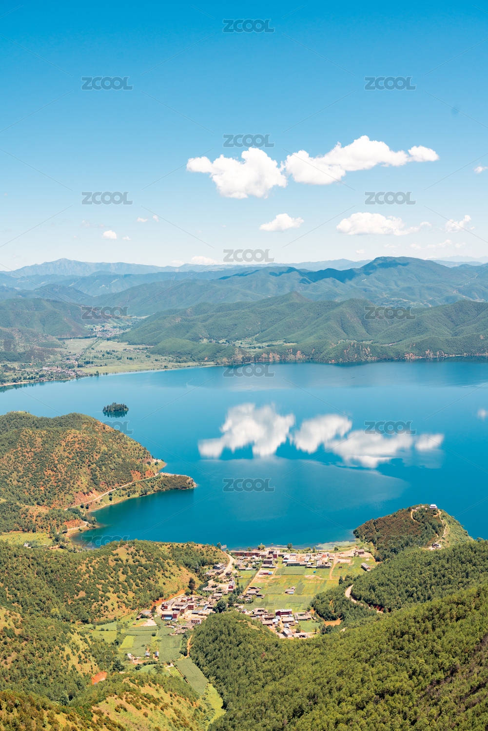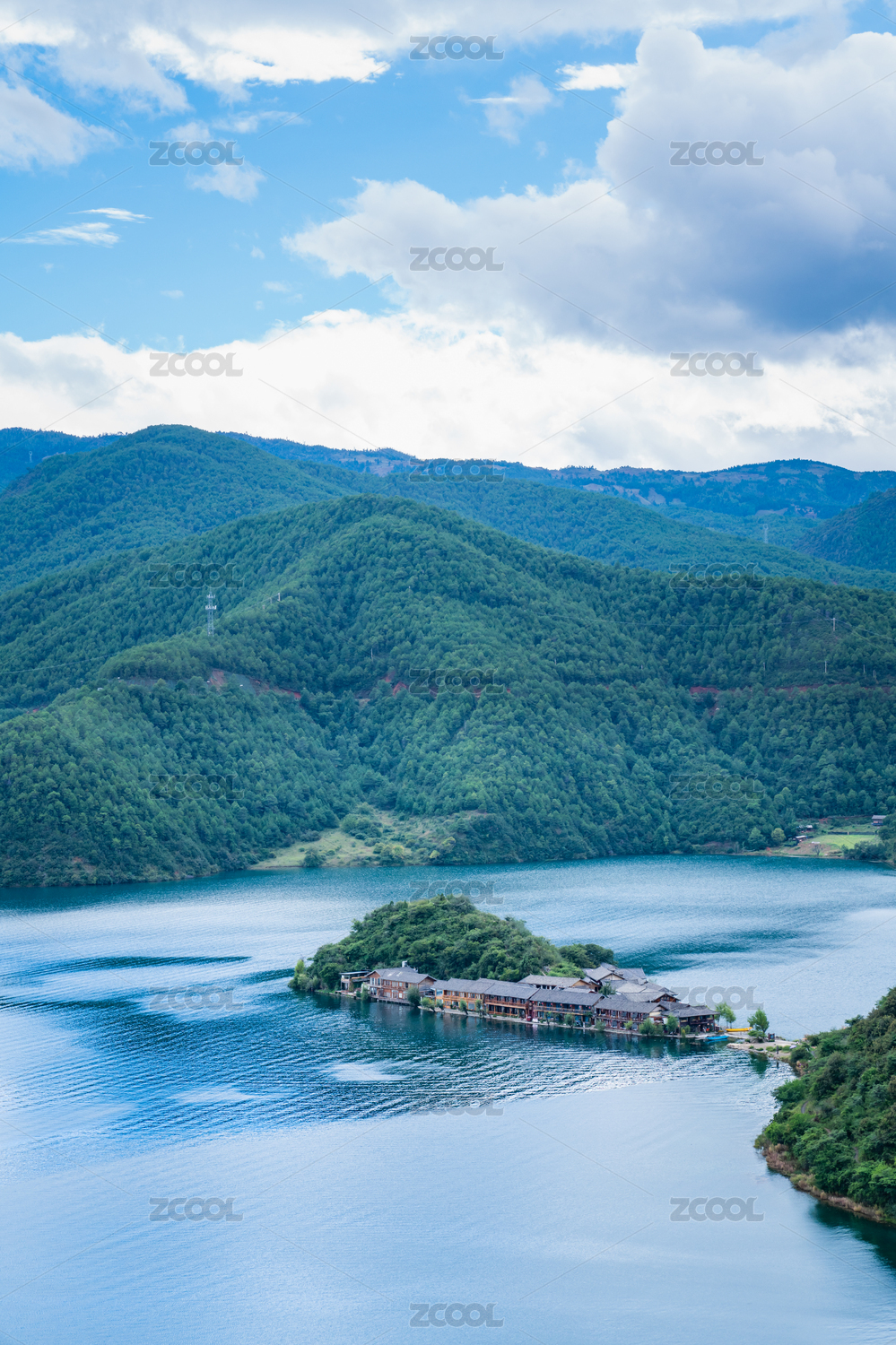 航拍泸沽湖湖心的岛屿