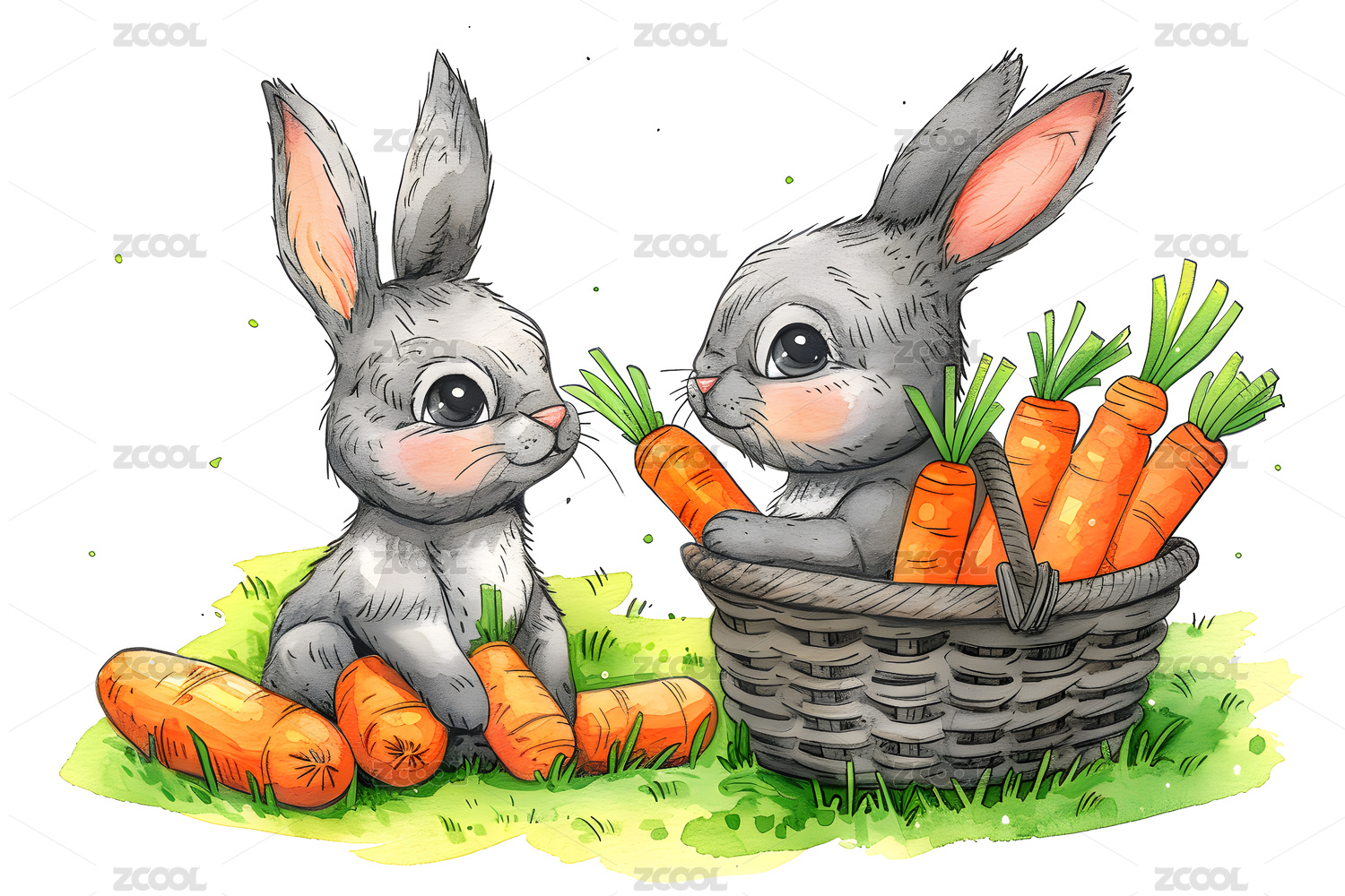一只可爱的小兔子和一筐胡萝卜