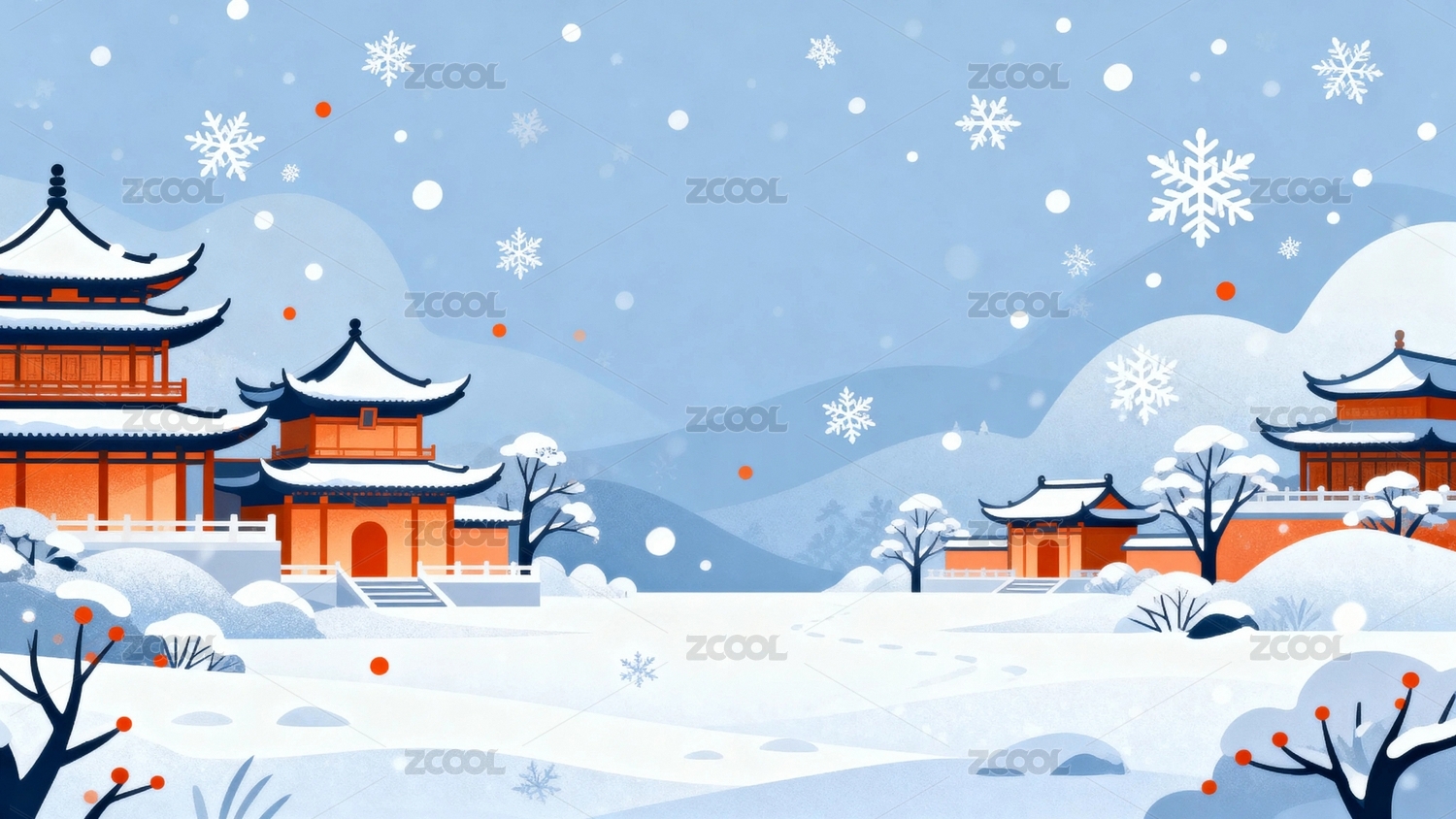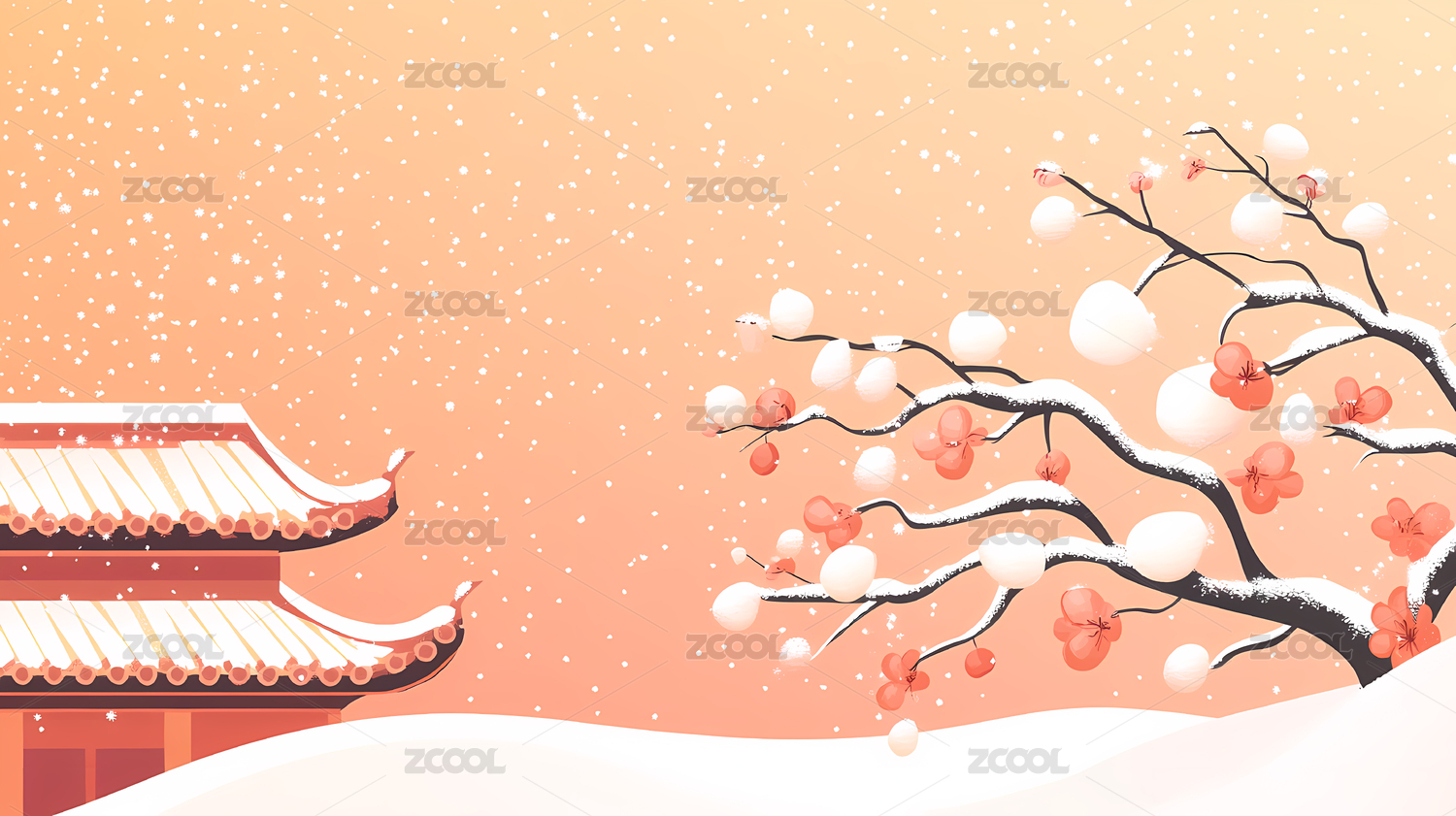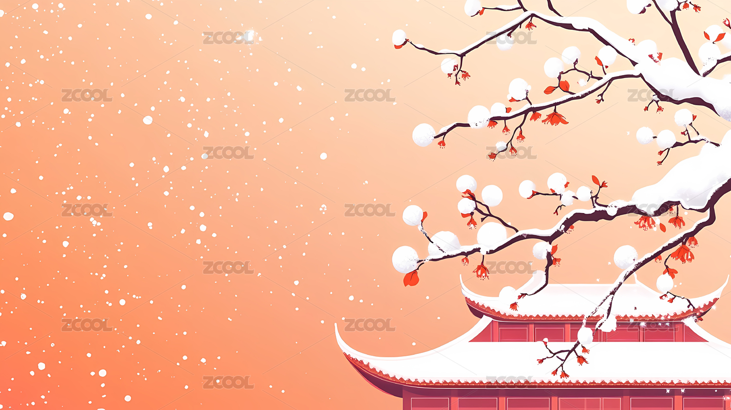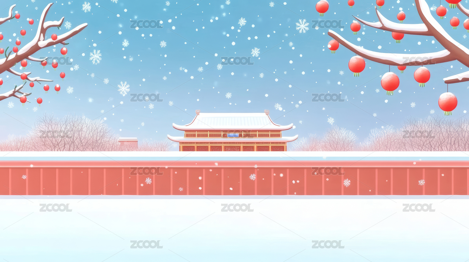 红色古建筑宫殿墙壁柿子树下雪雪景插画背景
