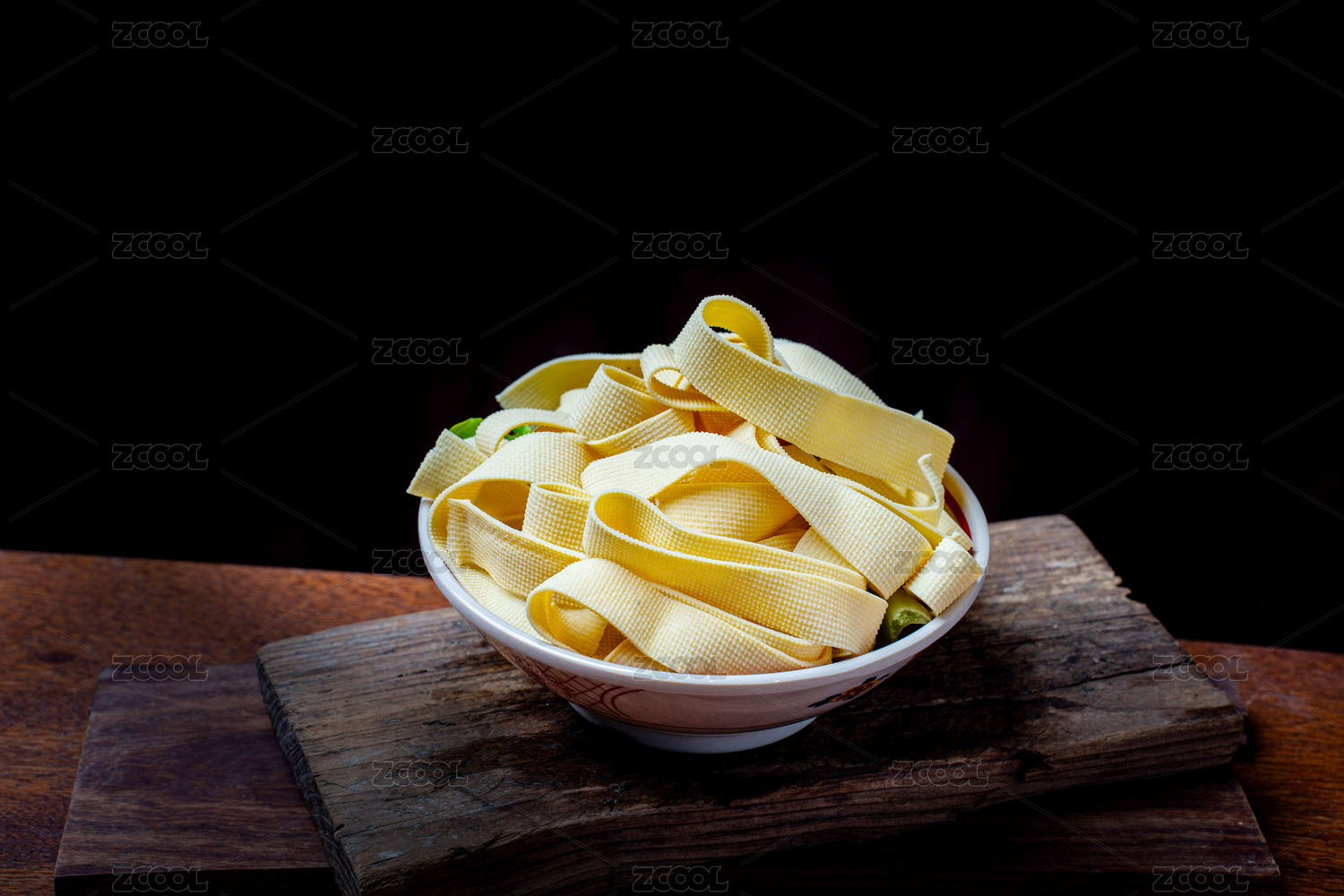 深色桌上白盘里的重庆老火锅菜品宽面条