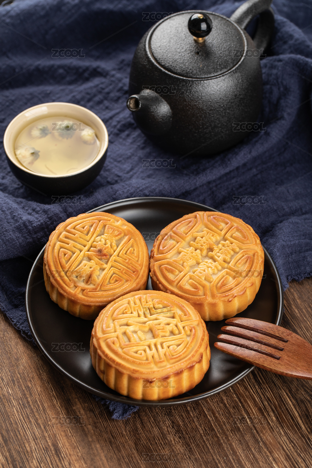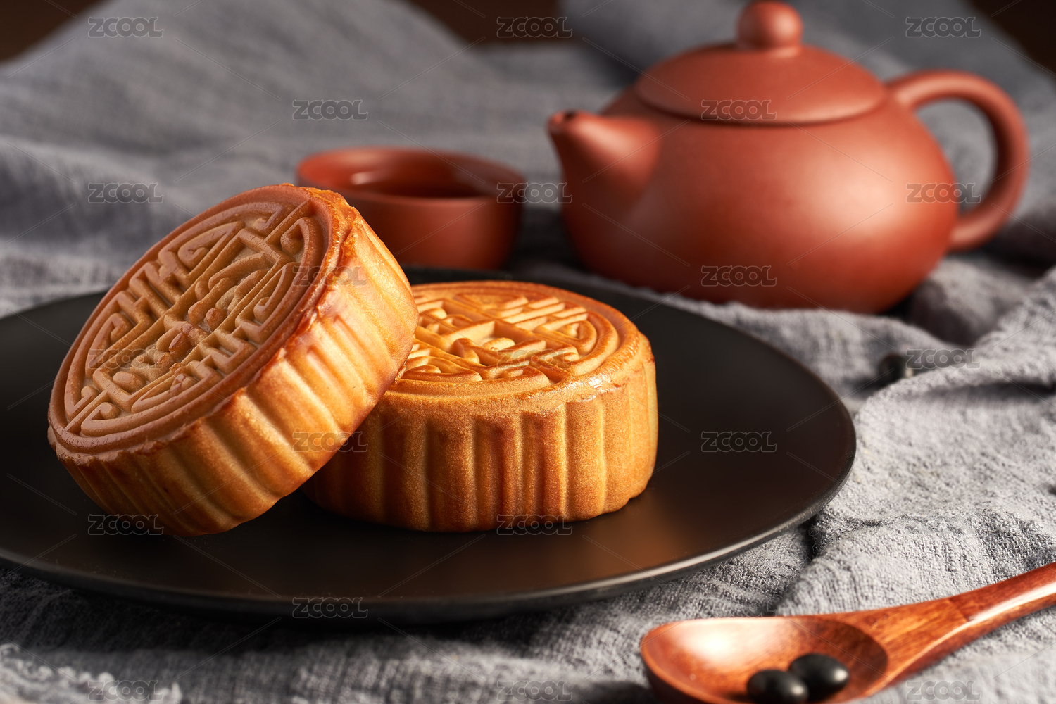 放在黑色盘子里面的中秋节月饼和茶具