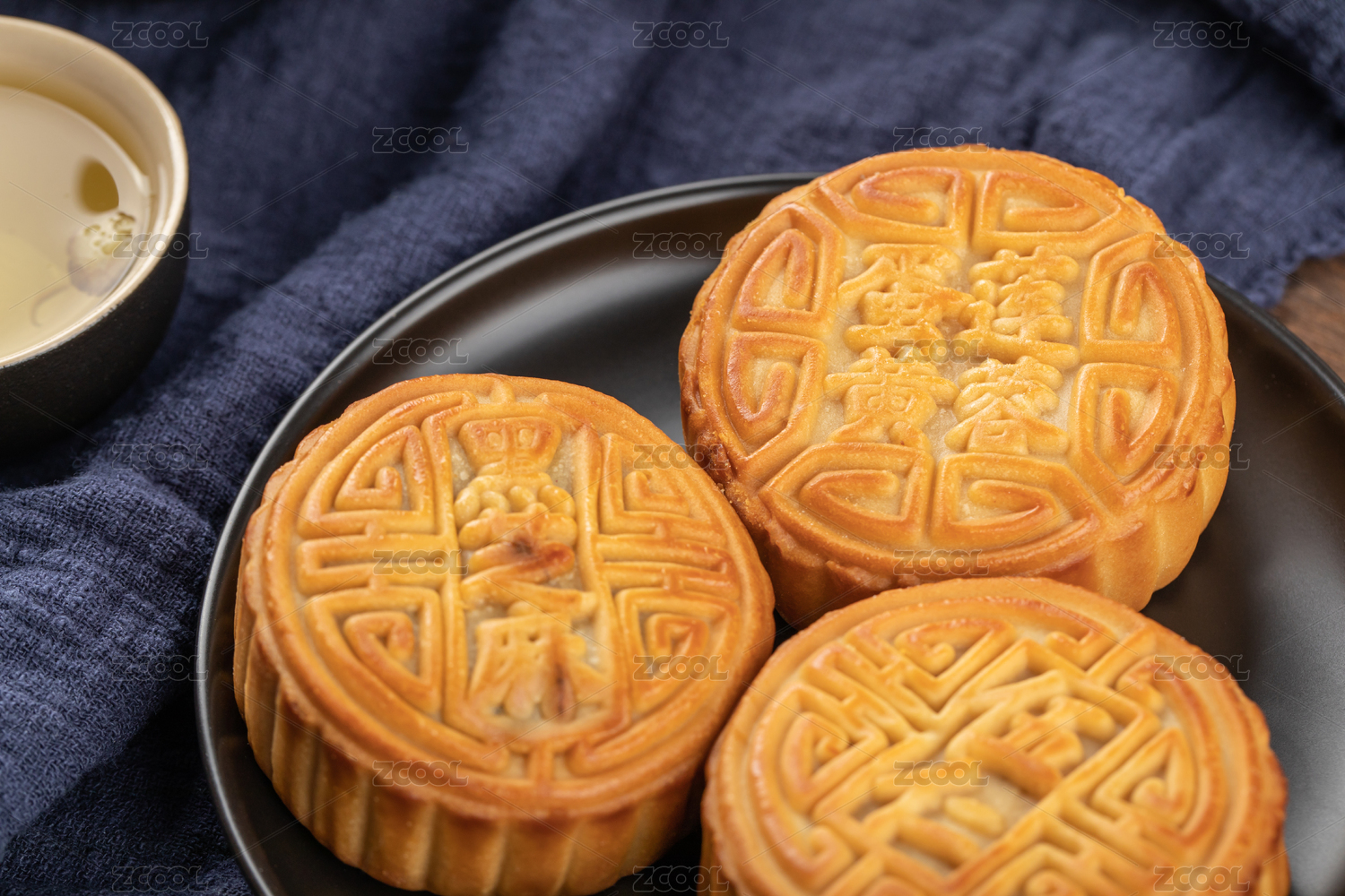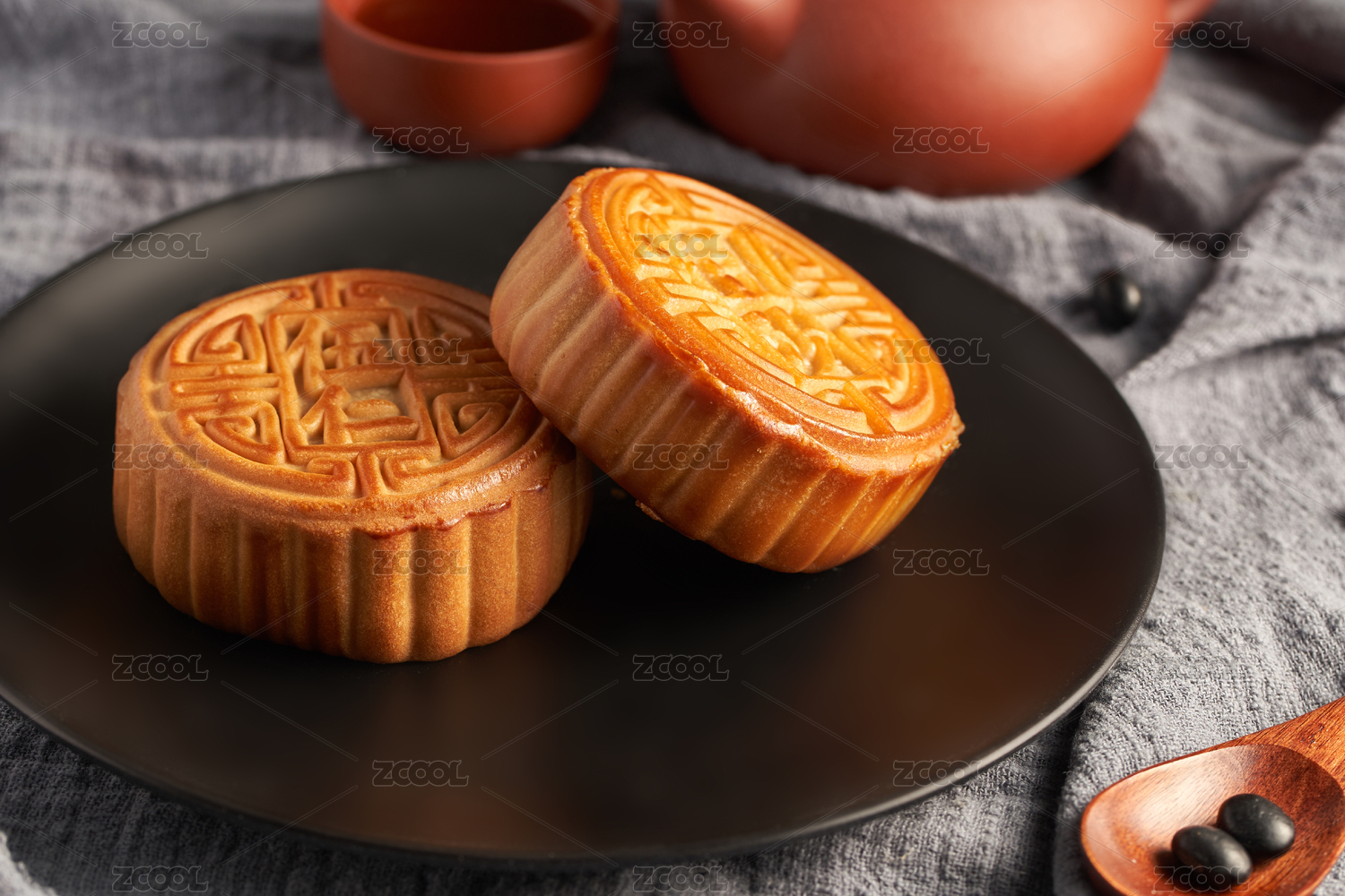 黑色陶瓷盘中的中秋节小吃月饼