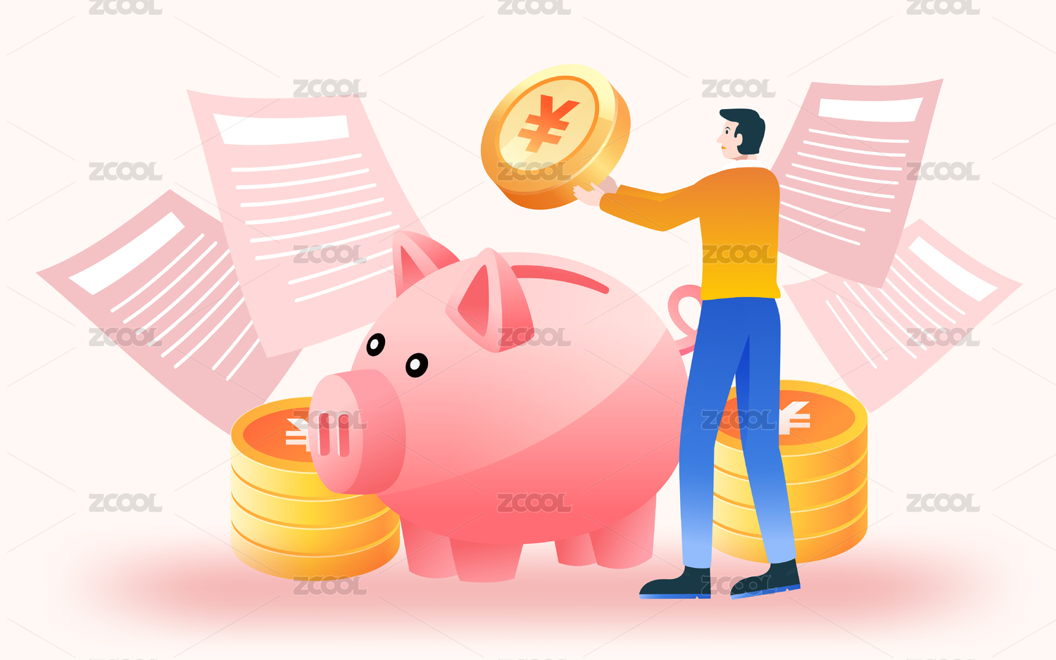 金融理财概念商务插画,职员在储蓄罐钱堆砌金币