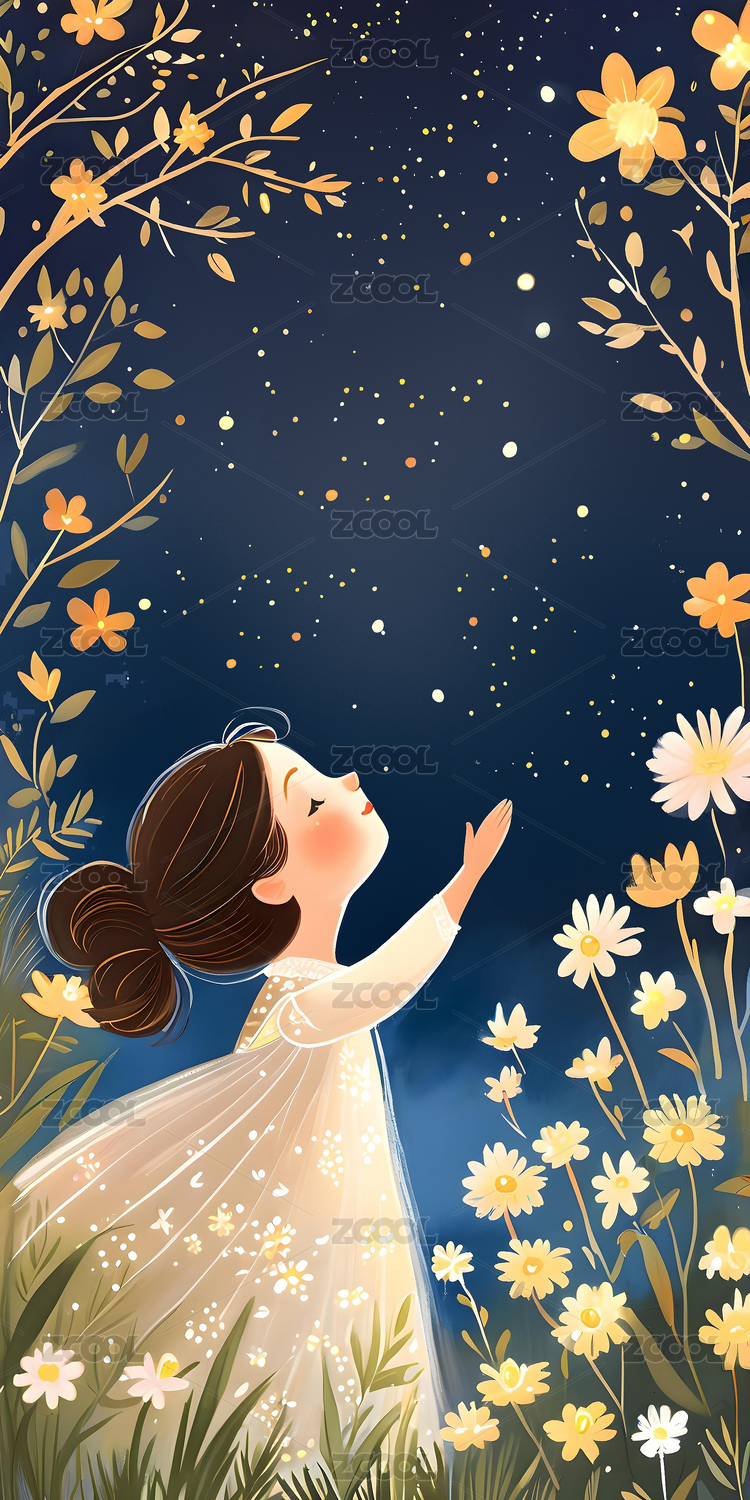 夜空下天使女孩伸手抓星空 梦幻星空背景
