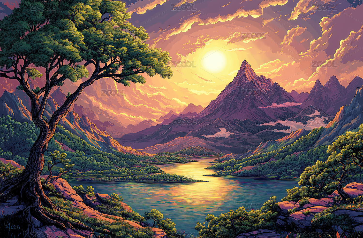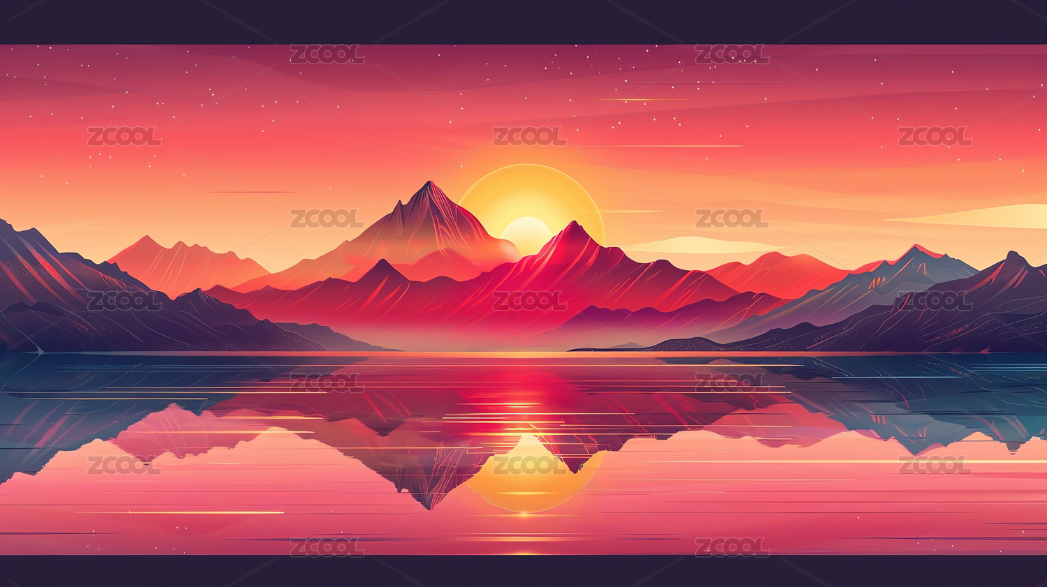 日落山水风景插画