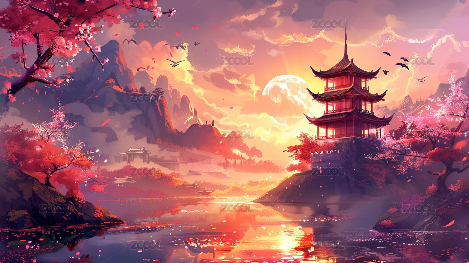 AIGC202404,国风,山水,城市,国画,湖泊,水面,亭子,建筑,山