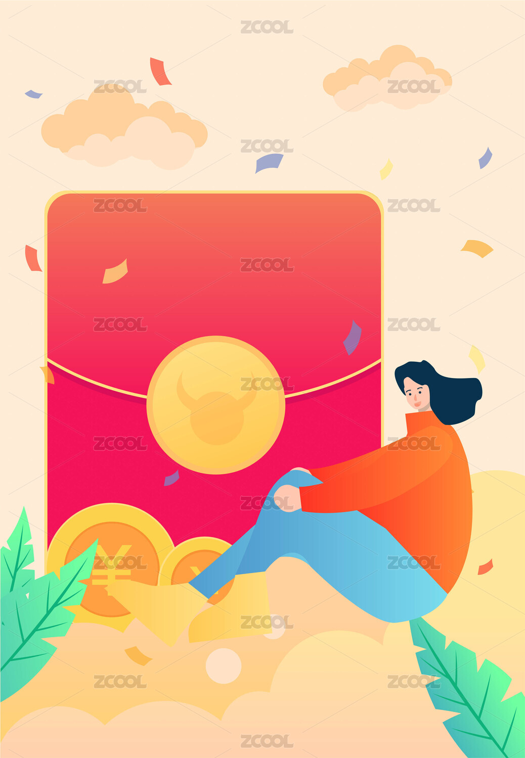 卡通手绘红包人物喜庆推广促销庆祝送红包金币插画