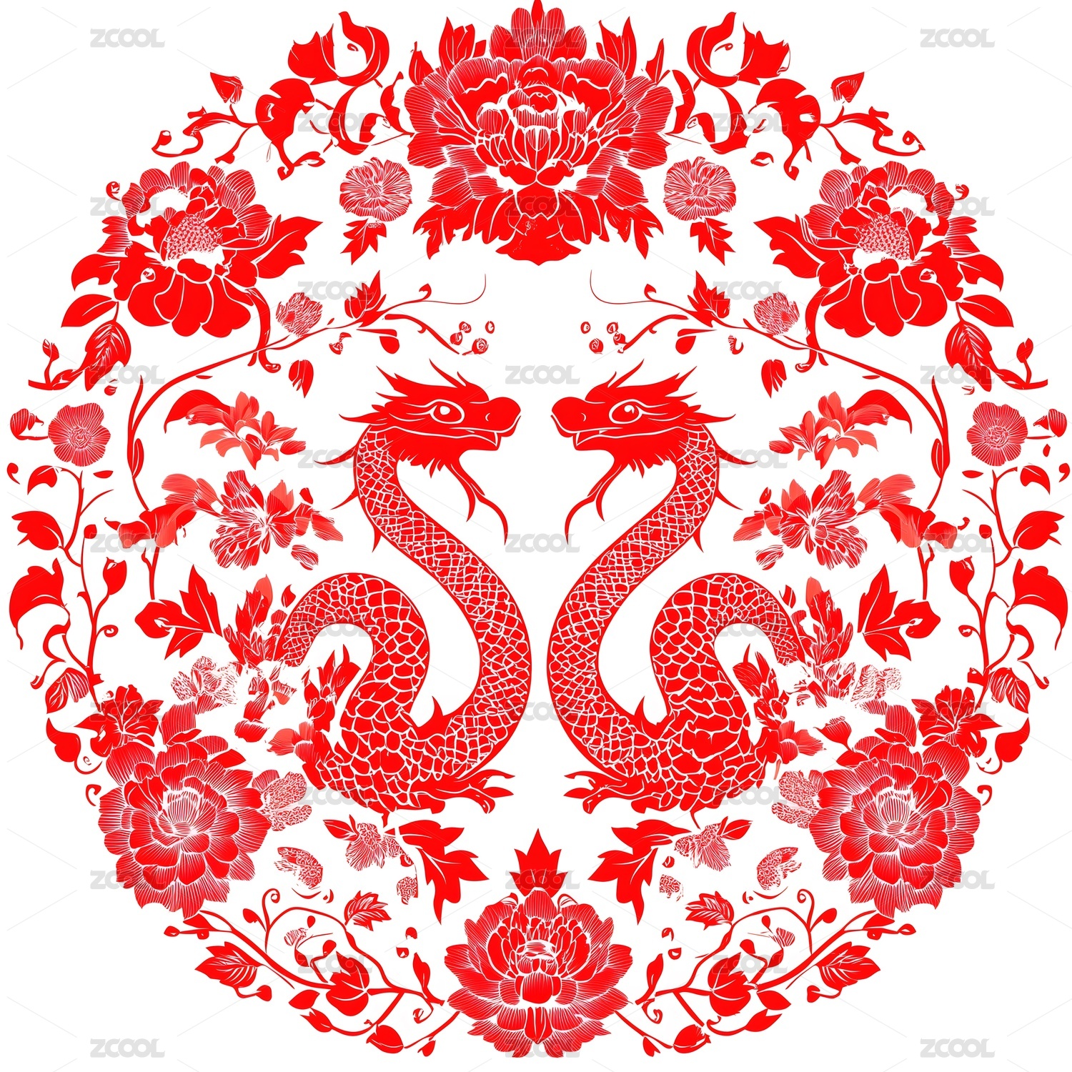 生肖龙花卉植物纹样圆形剪纸