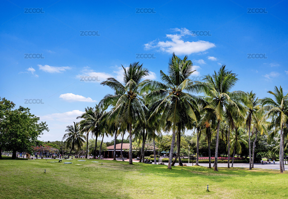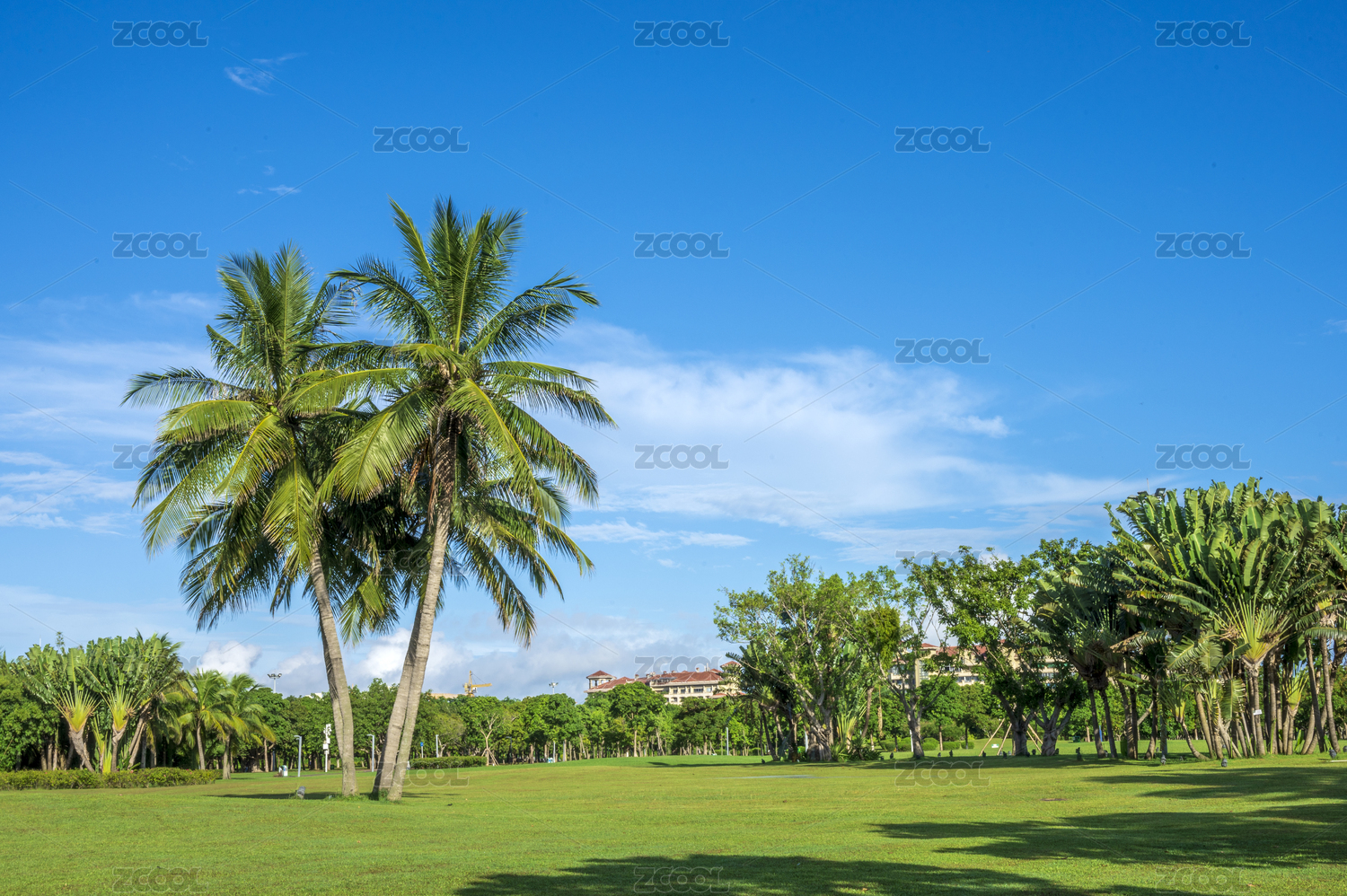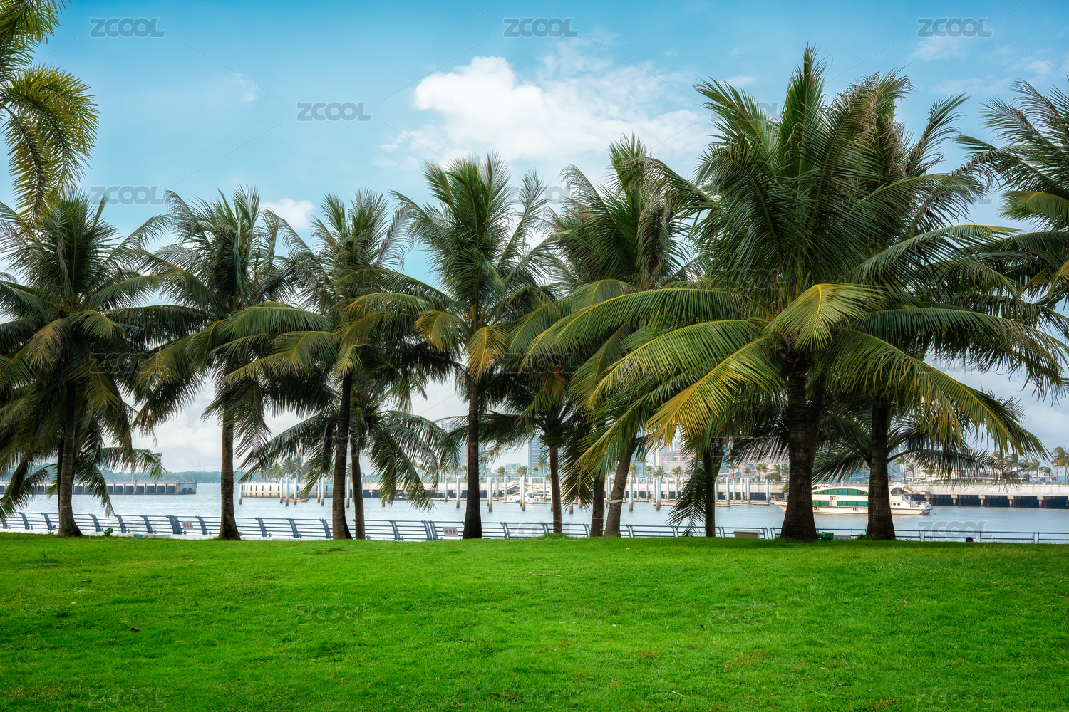 中国广东深圳深圳湾草坪椰树蓝天白云海边
