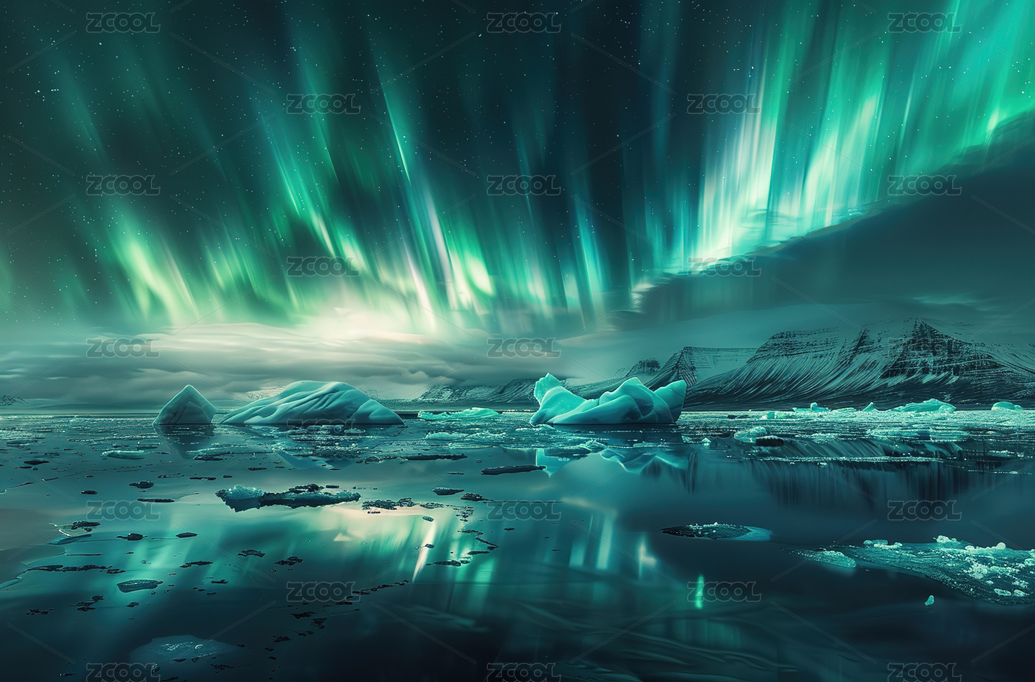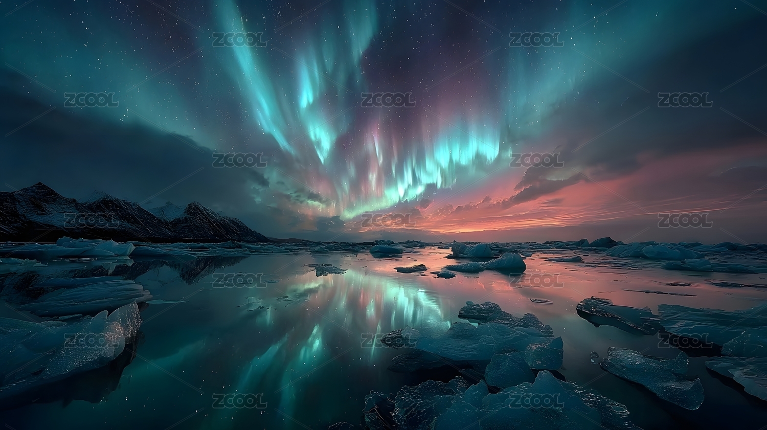 极光下的冰山倒影