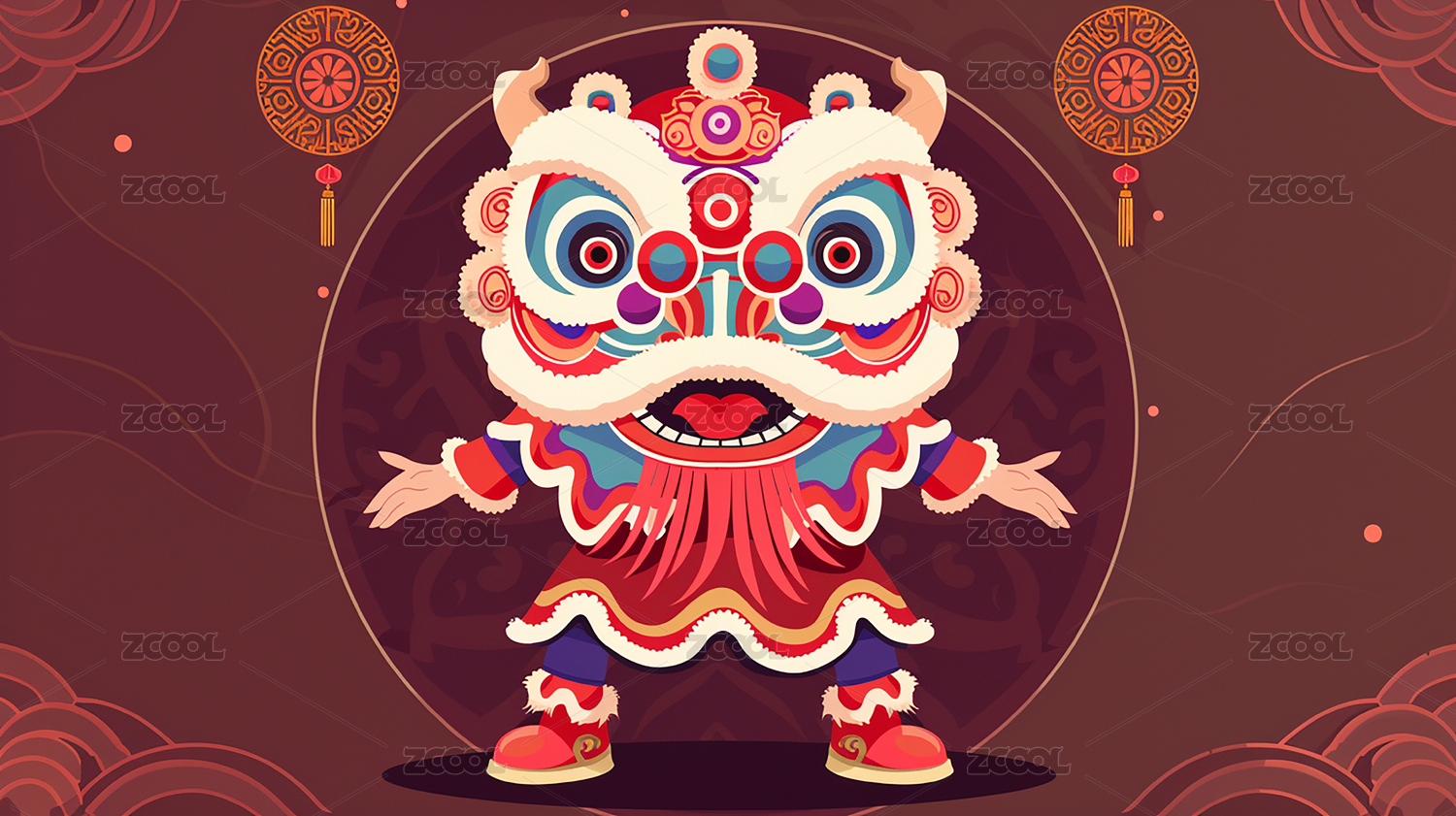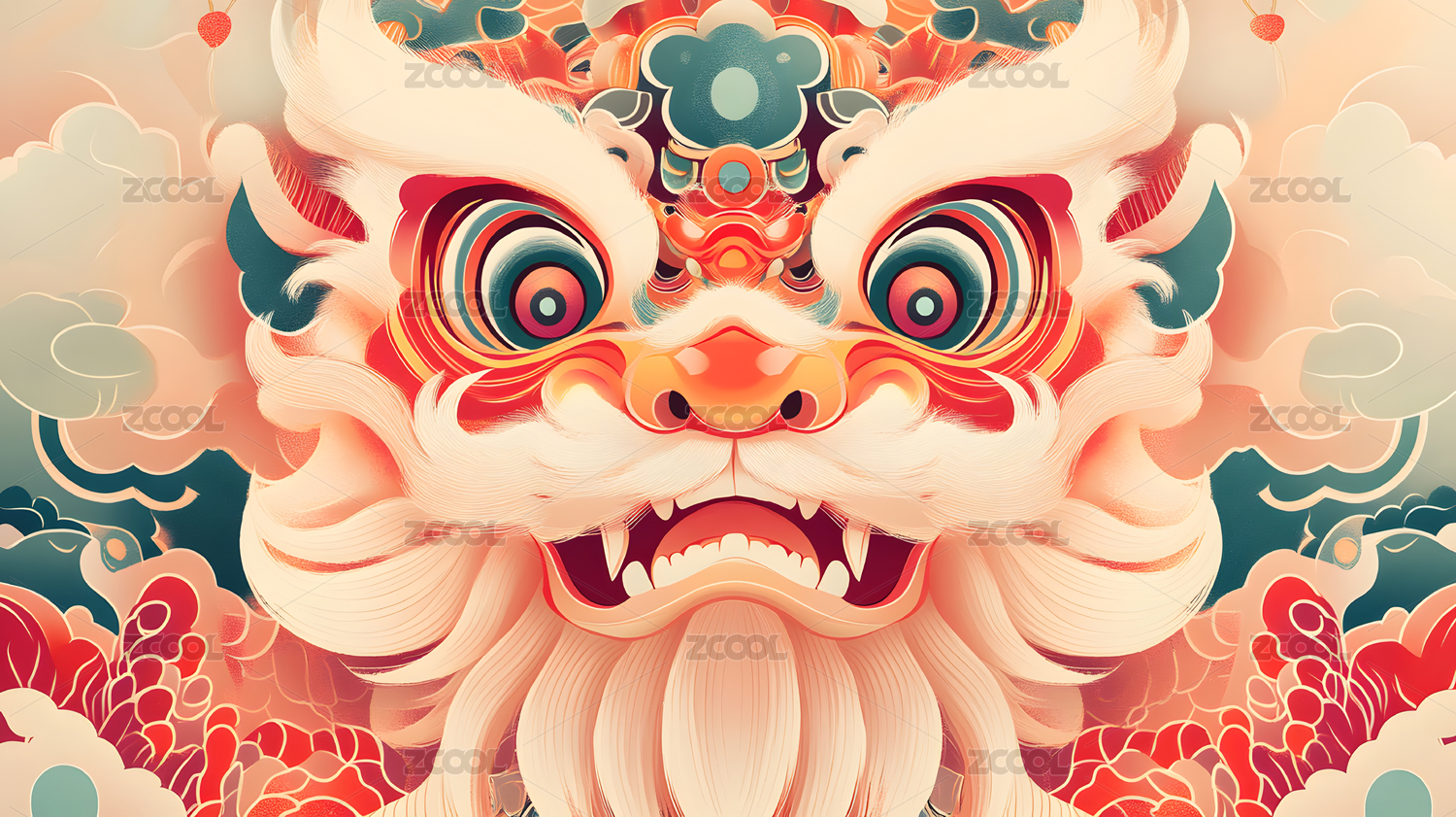 中式,国潮,国风,插画,背景,橙色,舞狮,醒狮,狮舞,狮子舞