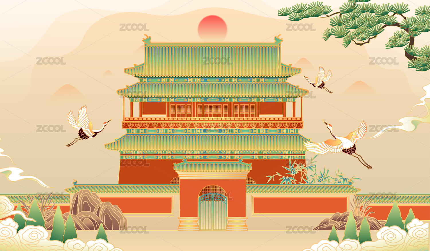 红色渐变大气国潮风插画故宫远山祥云