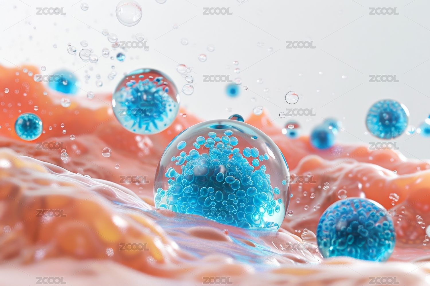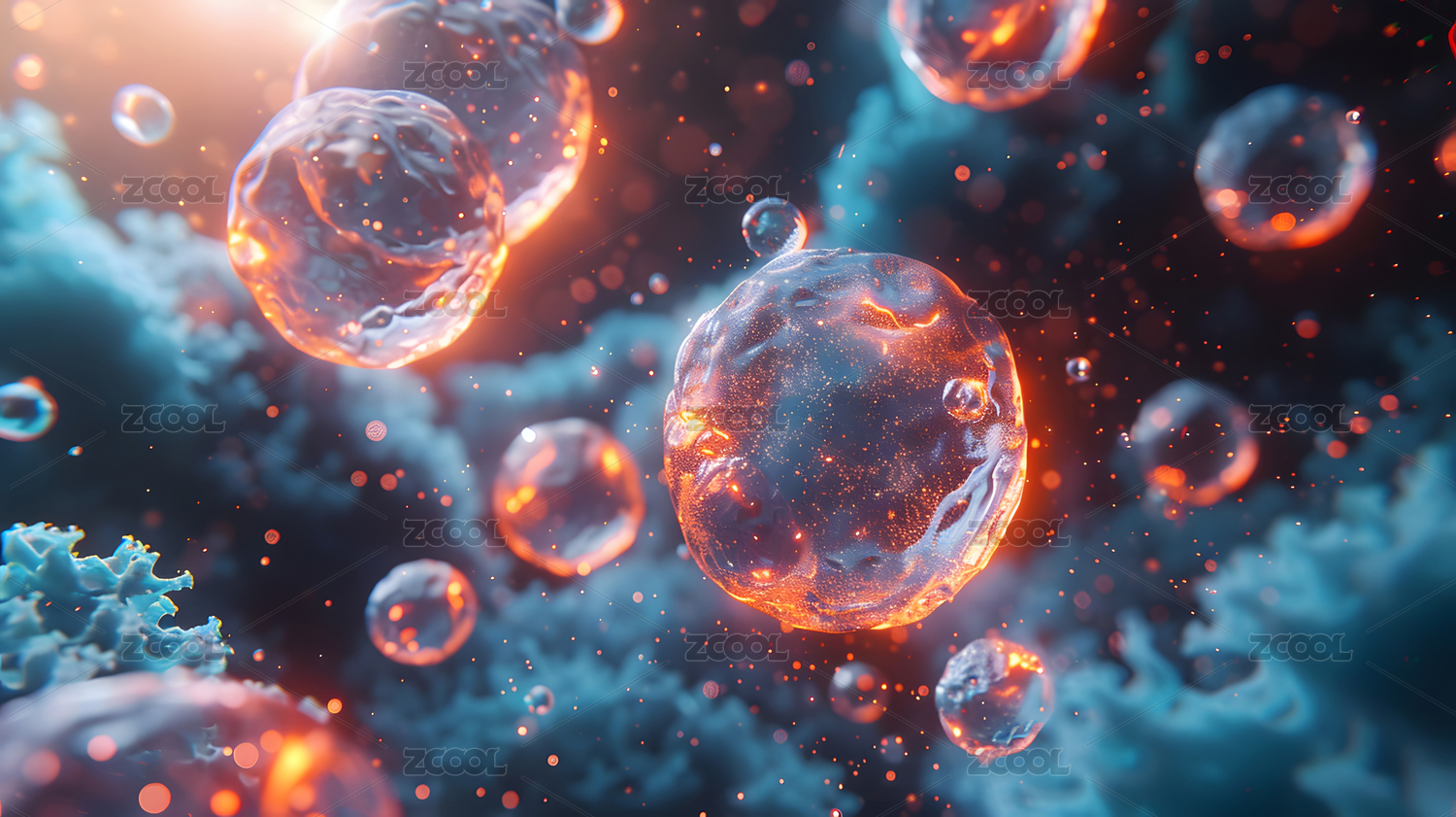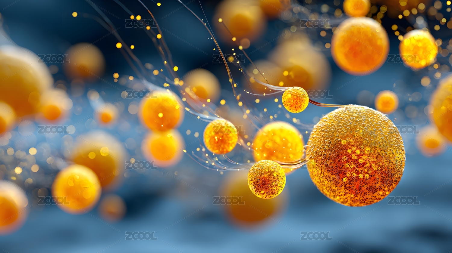 橙色细胞结构飘浮蓝底背景