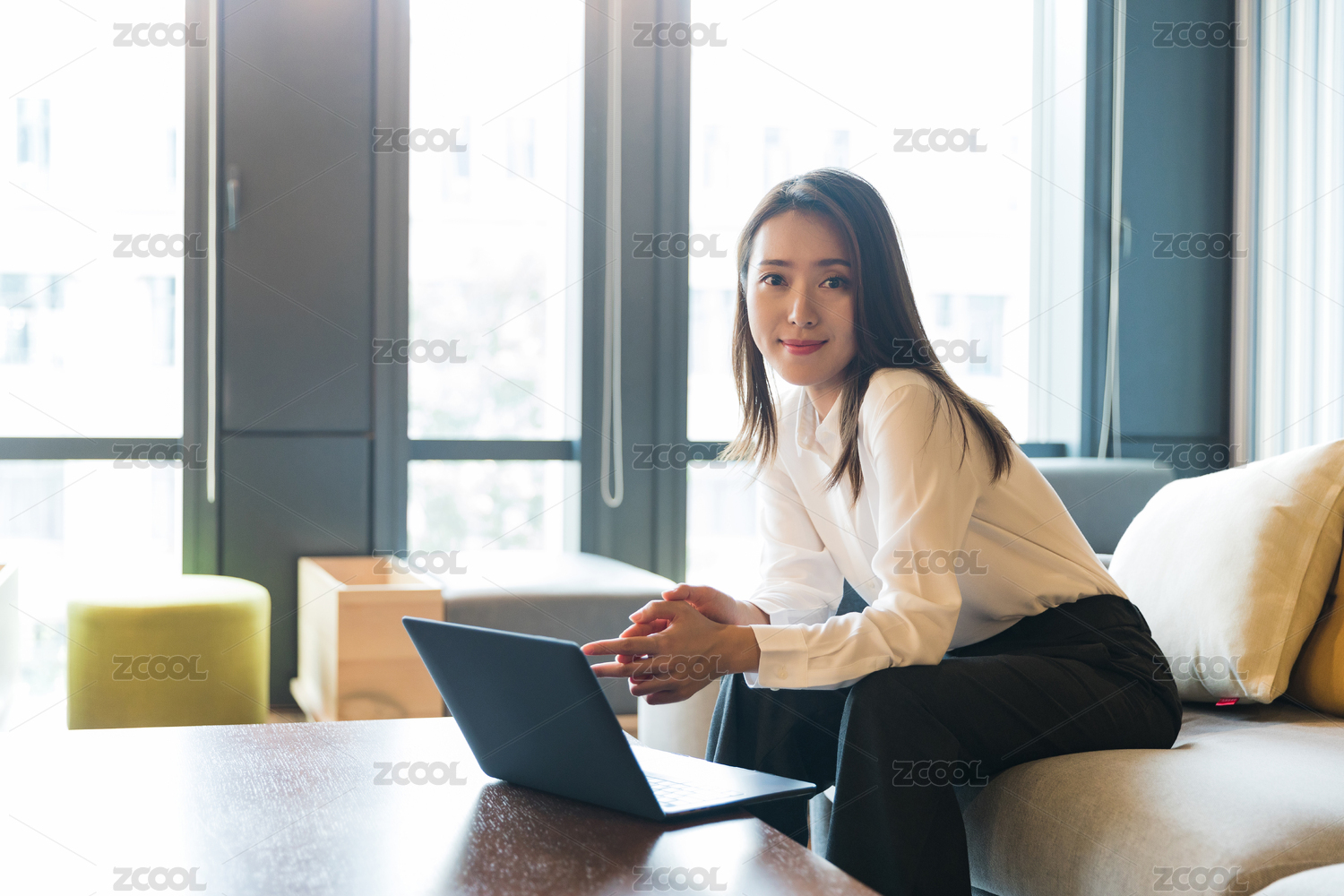 坐在沙发上使用笔记本电脑工作的职业女性形象