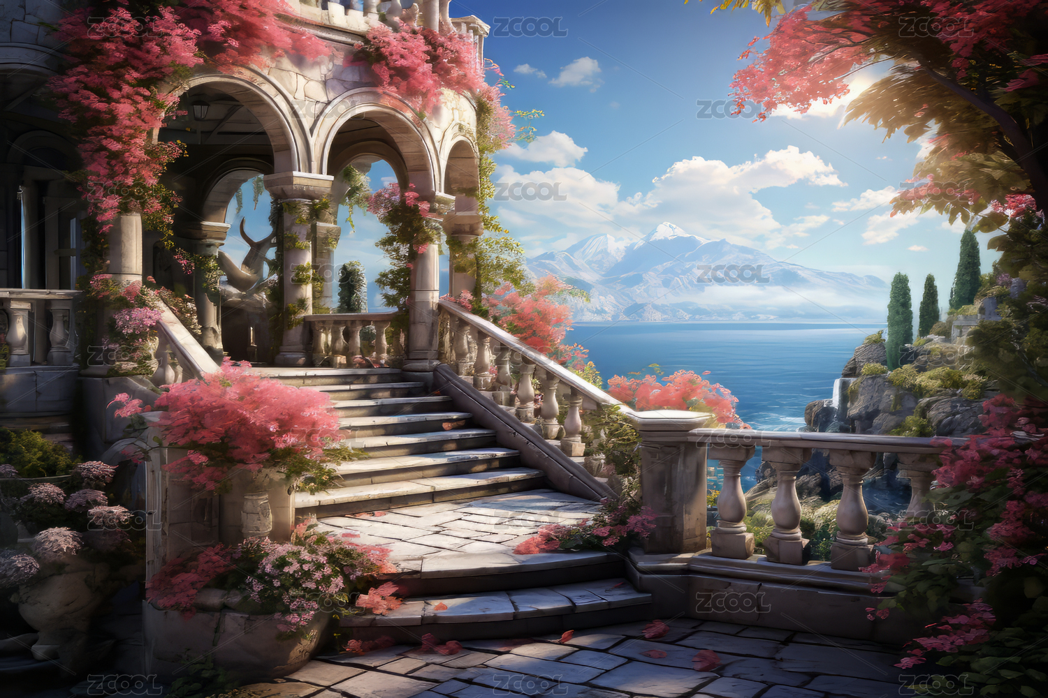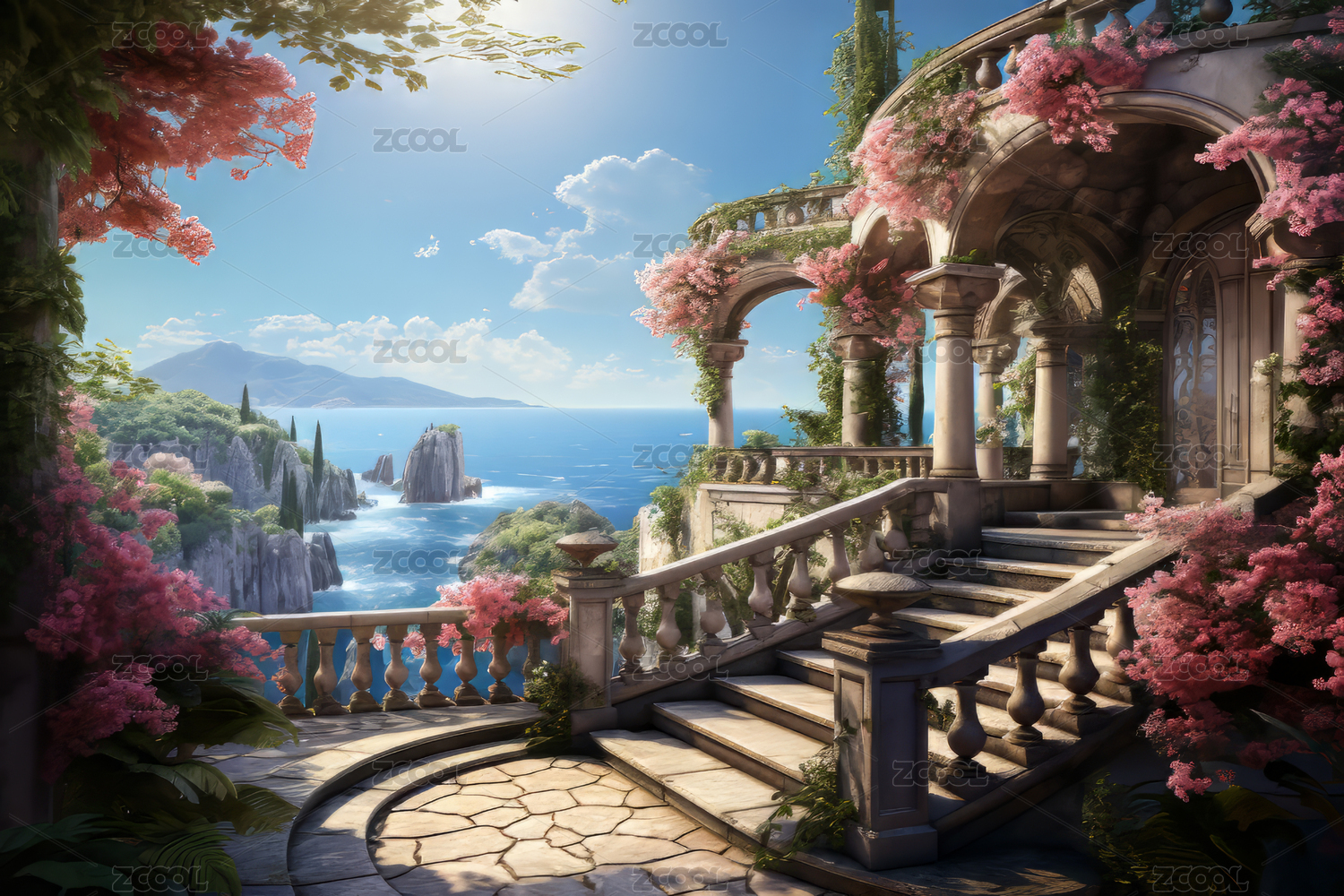 悬崖城堡建筑鲜花日出日落梦幻唯美创意设计